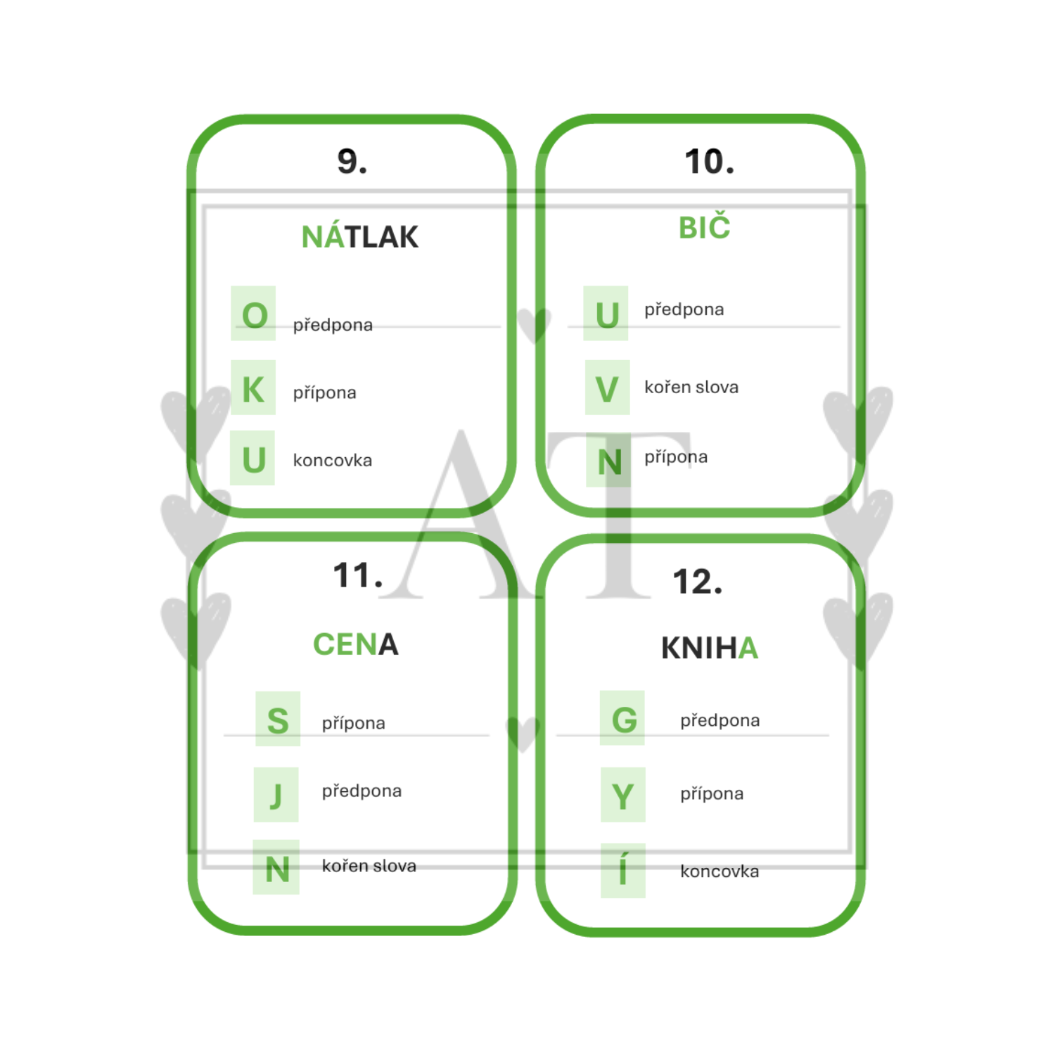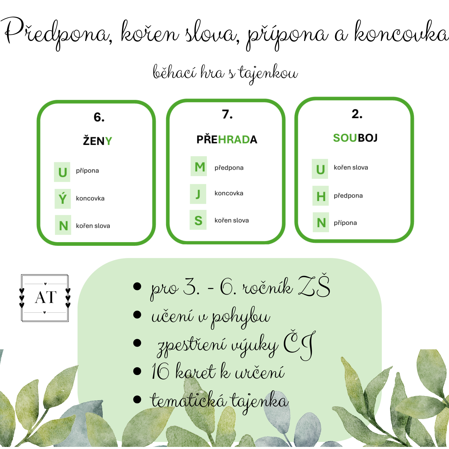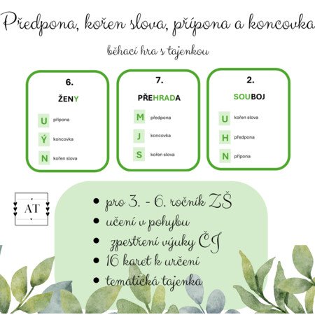 Běhací hra pro celou třídu nebo i pro jednotlivce k procvičení určování předpony, kořene, přípony a koncovky ve slovech. Soubor obsahuje 16 karet se slovy a tři možnosti odpovědi. Jen jedna je však správná. Po určení zvýrazněné části slova (zda se jedná o předponu, příponu, kořen slova nebo koncovku) u všech slov vyjde žákům tajenka, kterou si zapisují do svého pracovního listu. Nakonec si práci kontrolují podle kontrolky. Ideální k rychlému procvičení probraného učiva.