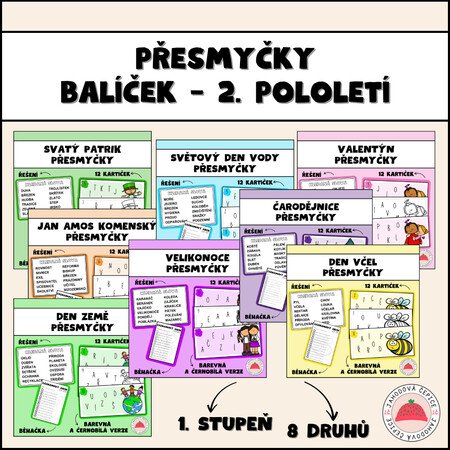 Balíček obsahuje 8 zábavných her, které jsou ideální pro žáky, kteří si chtějí otestovat své dovednosti při luštění přesmyček. Žáci si procvičí svou slovní zásobu a kreativitu při luštění přesmyček spojených s tematikou - Valentýn, Den svatého Patrika, Den včel, J. A. Komenský, Světový den vody, Den Země, Čarodějnice a Velikonoce.