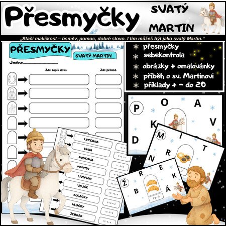 Všechna slova se vztahují ke svátku sv. Martina – děti si tak připomenou tradice, symboly a význam tohoto dne (husa, podkova, lucerna, voják, koláčky, vločky, žebrák…).