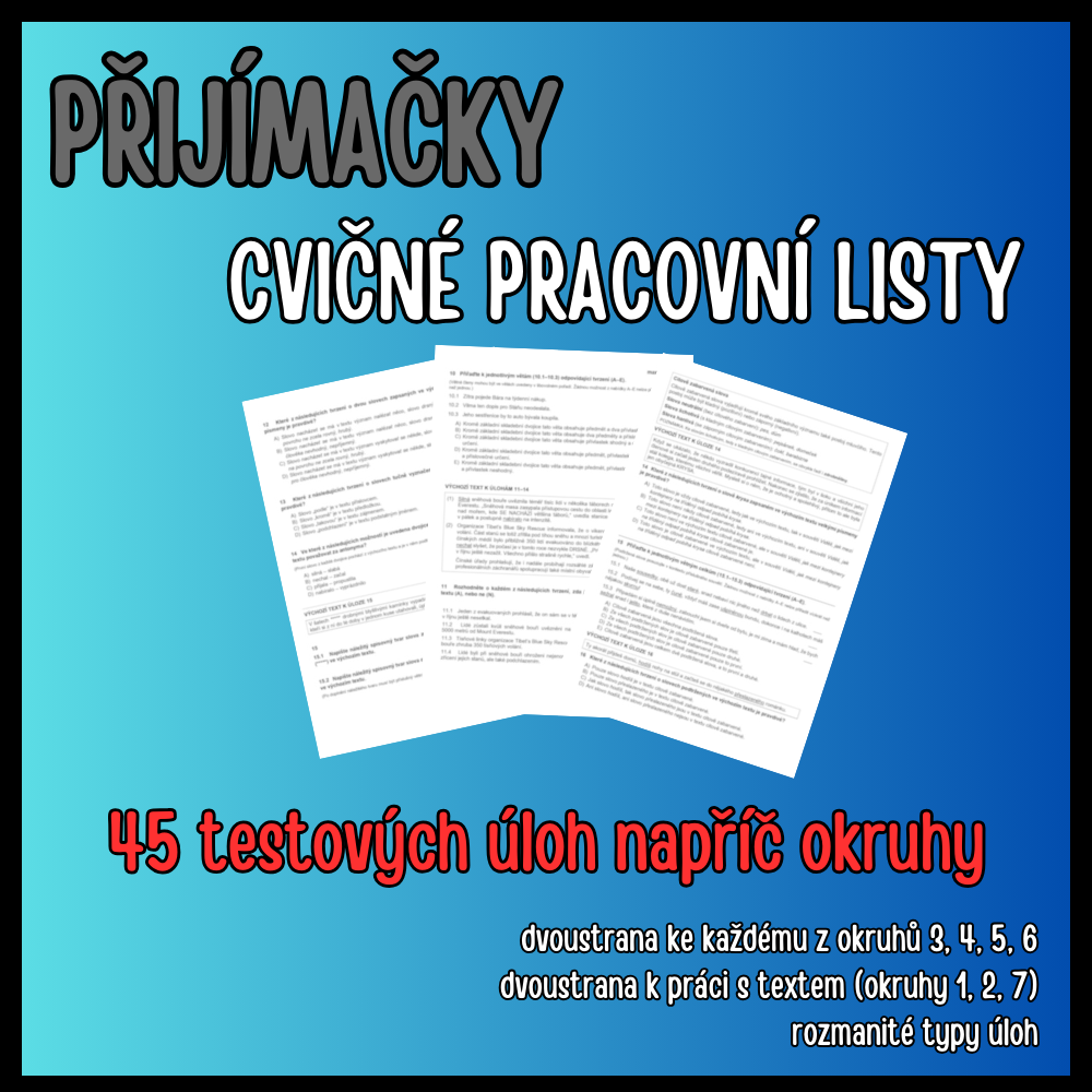 - V materiálu se nachází různé typy otázek (celkem 45) inspirované reálnými úlohami vyskytujícími se u přijímaček v posledních letech.