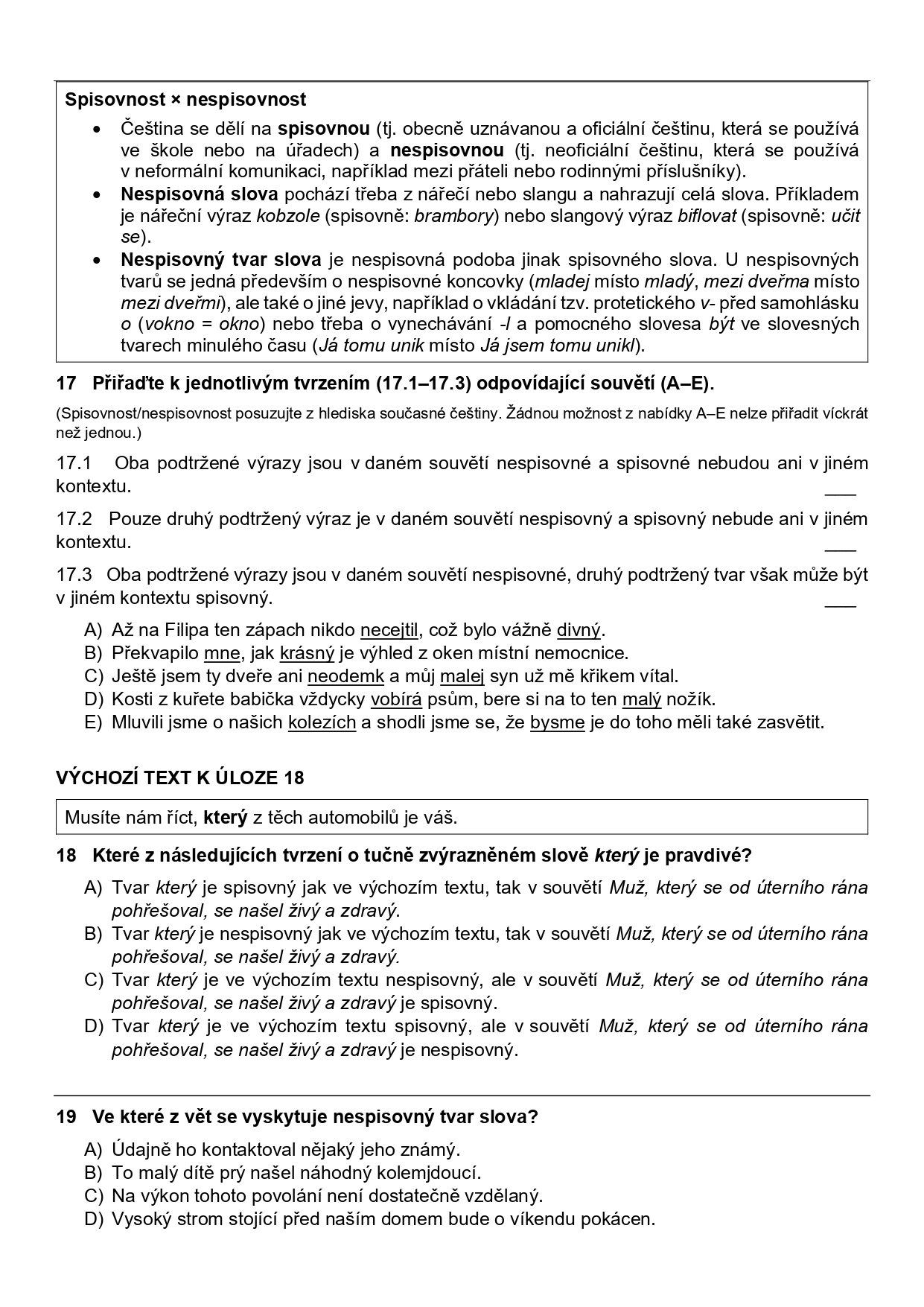 Úloha měsíce – Tato část obsahuje pomůcku k přijímačkové úloze „Vyhledejte ve výchozím textu čtyři slova, která jsou zapsána s pravopisnou chybou, a napište je pravopisně správně“ a 6 těchto úloh k procvičení.