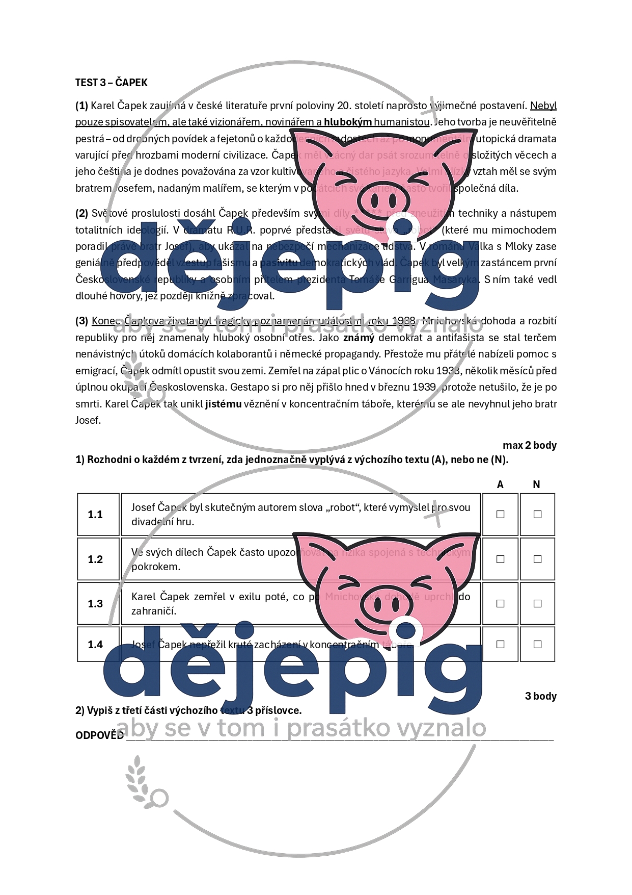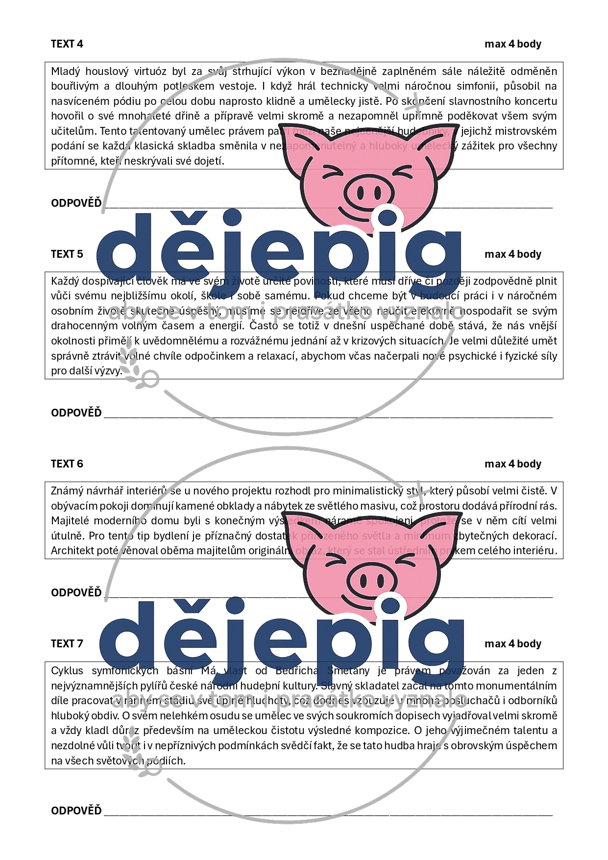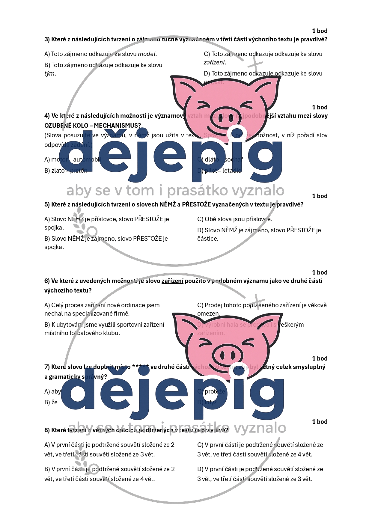 - 3 sady po 8 úlohách – výchozí text a na něj navázané úlohy na určování správnosti tvrzení, hledání slovních druhů, doplňování vhodného tvaru slova, vybírání synonym či antonym apod.