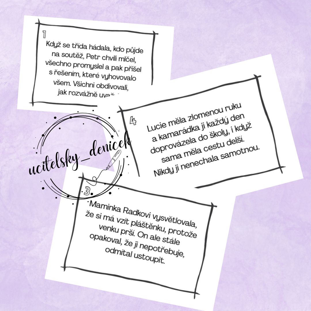 - Karty se situacemi můžeme vytisknout a nechat žáky ve dvojicích přiřazovat k přirovnáním. Můžeme je také ale jen přečíst a společně s dětmi si říci, které přirovnání (s oporou vyplněné kartičky) v situaci poznávají, které by přiřadili.
