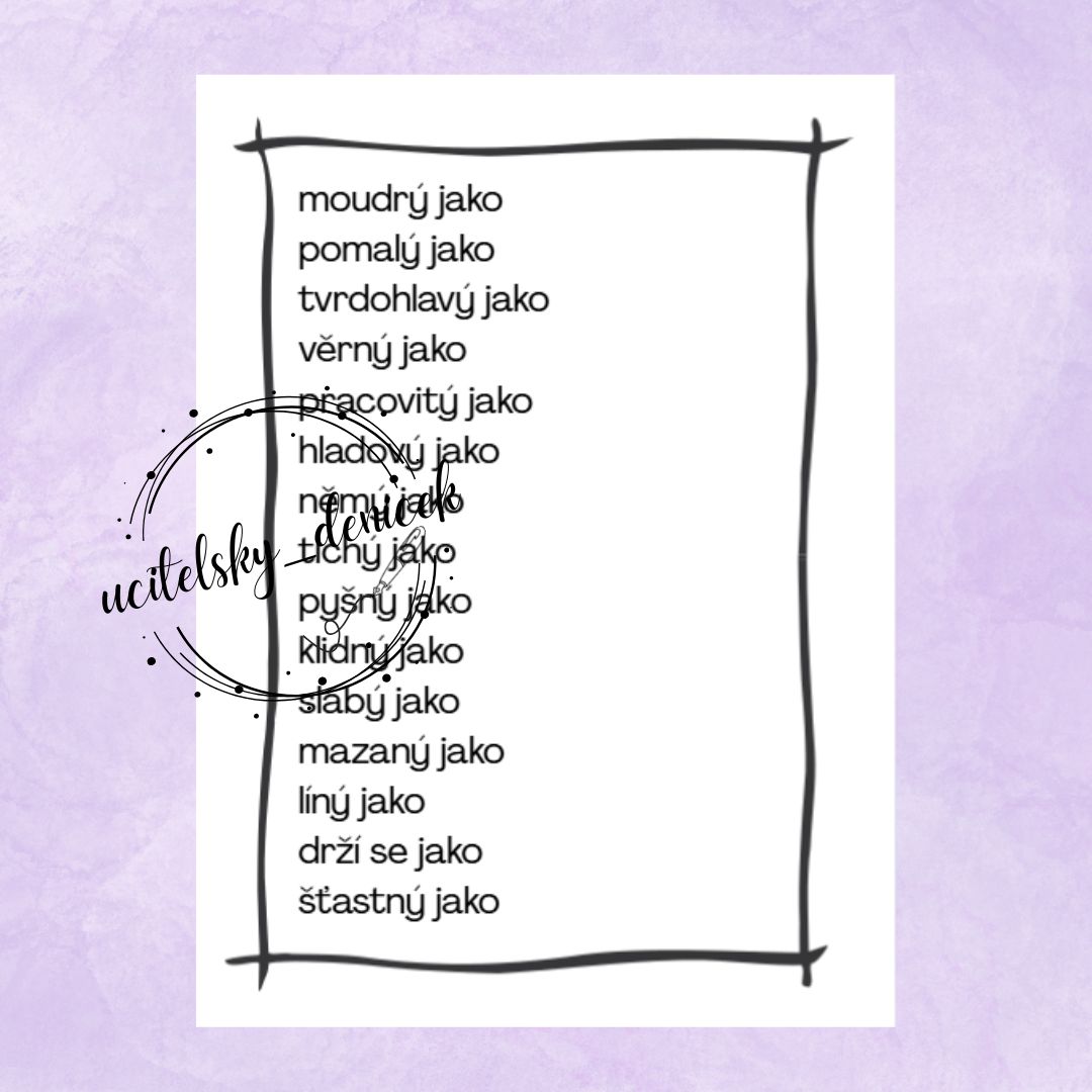 - Nachystáme si barevně vytištěné obrázky se zvířaty. Žáci pracují ideálně ve dvojicích. Já jsem obrázky pro každou dvojici nachystala na chodbu, aby se děti i trochu rozhýbaly. Na pokyn vyrazí dvojice k obrázkům a mají minutu (nebo dle vaší úvahy) čas na zapamatování. Pak mají další minutu na návrat do lavic a zápis toho, co si zapamatovali. Následuje společná kontrola. Poté žákům rozdáme lístečky se začátky přirovnání a necháme je doplňovat slova, která sesbírali. Některá se mohou lehce lišit - hlemýžď / šnek, osel / mezek... s dětmi si vysvětlíme. Společně přečteme a ujasníme všechna přirovnání.