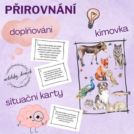 Tento materiál je určený k práci s přirovnáními především pro druhý stupeň základní školy. Obsahuje dvě varianty téže přípravy - jedna je ryze zvířecí, druhá mix. Tyto varianty jsou rozlišeny různými tipy rámečků. Aktivity obsahují vždy i řešení.
