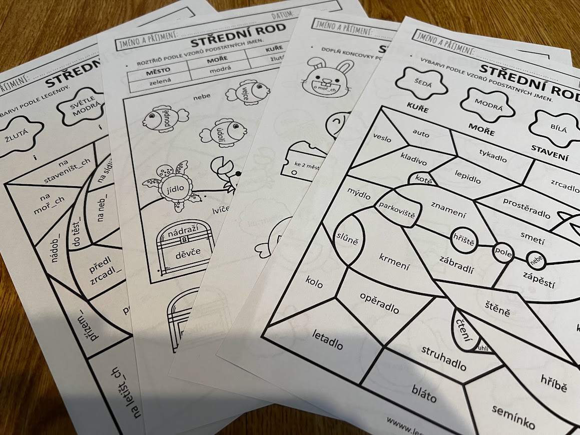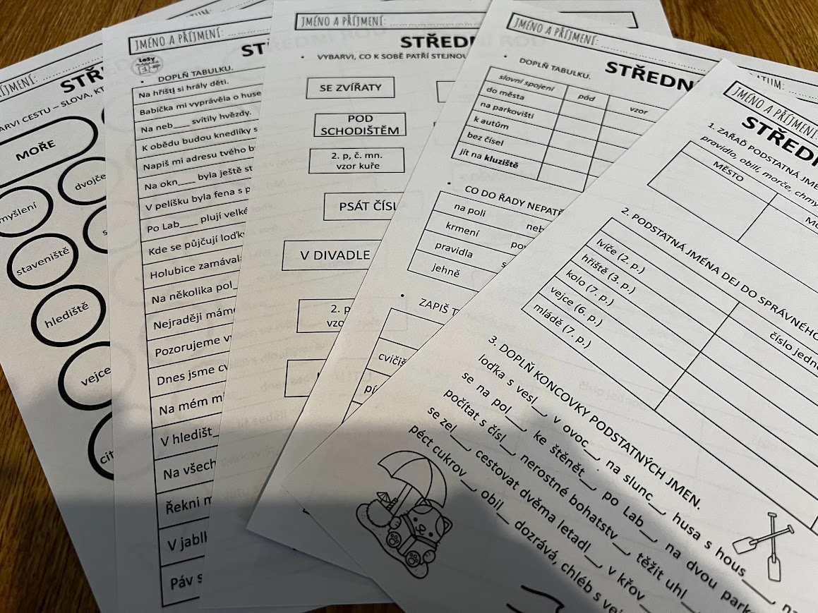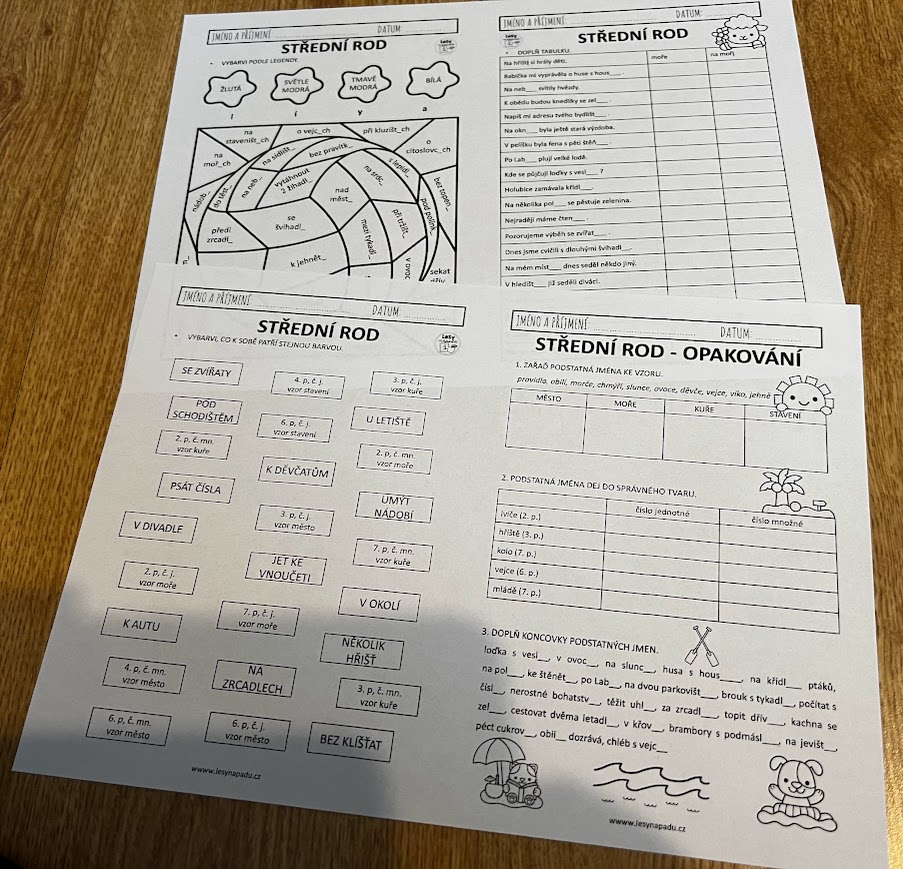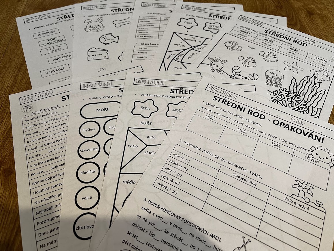 OKRUHY: podstatná jména, vzory podstatných jmen, mluvnické kategorie, střední rod, pád a číslo podst. jmen, omalovánka, pravopis koncovek, moře, doprava, sport