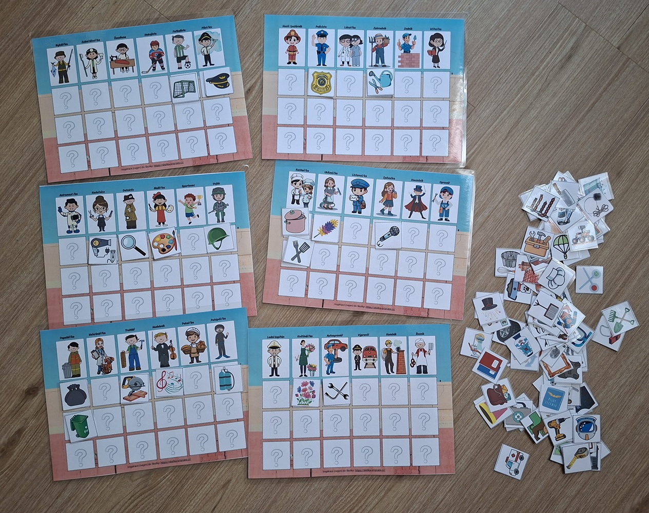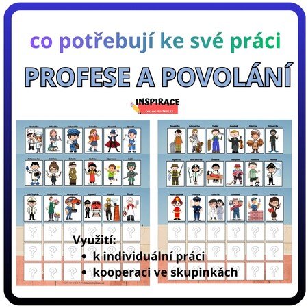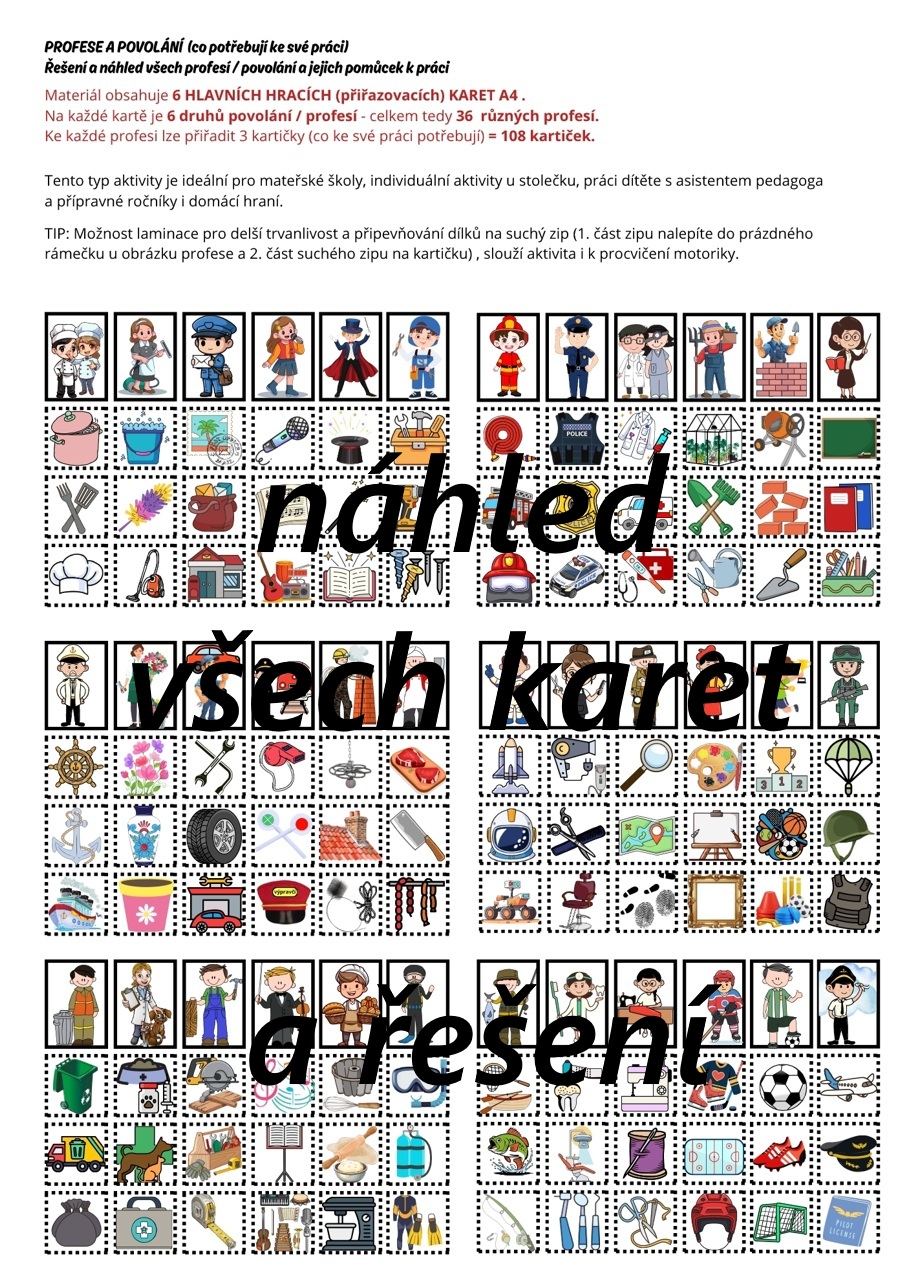 TIP: Možnost laminace pro delší trvanlivost a připevňování dílků na suchý zip (1. část zipu nalepíte do prázdného rámečku u obrázku profese a 2. část suchého zipu na kartičku) , slouží aktivita i k procvičení motoriky.