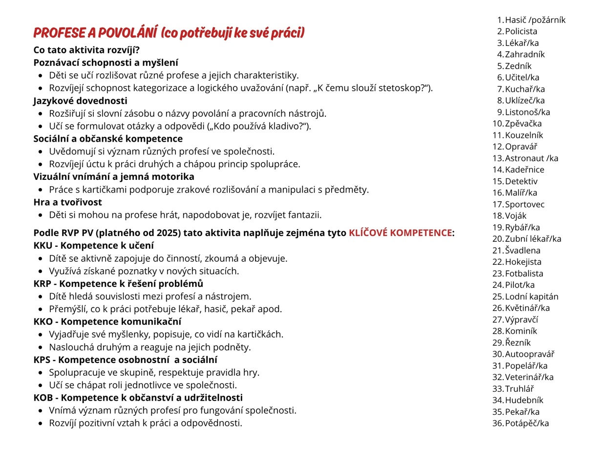 - Děti se učí rozlišovat různé profese a jejich charakteristiky.