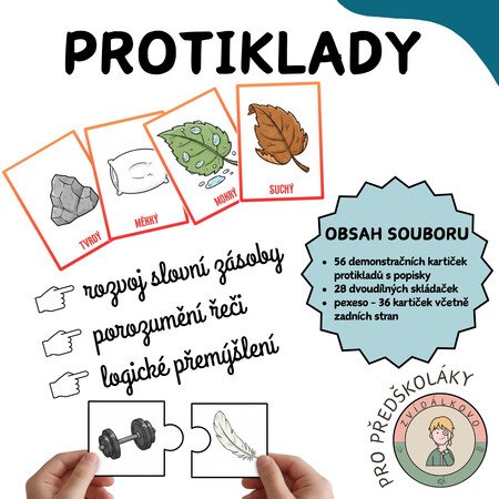 Zvídálkovo Protiklady je soubor aktivit, které jsou vhodně na procvičování a upevňování slovní zásoby pro děti v mateřské škole. Primárně je soubor určen pro předškoláky, ale využití najde i v nižších ročnících základní školy.
