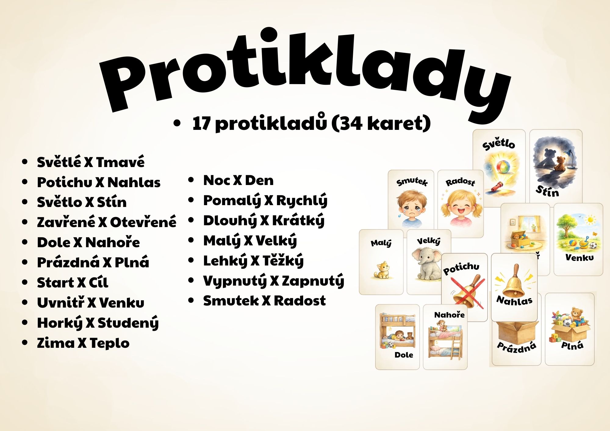 Materiál obsahuje 17 protikladů (34 karet) v rozložení vždy dvě karty na jeden list. Jsou doplněny ilustracemi pro upřesnění jejich významu.