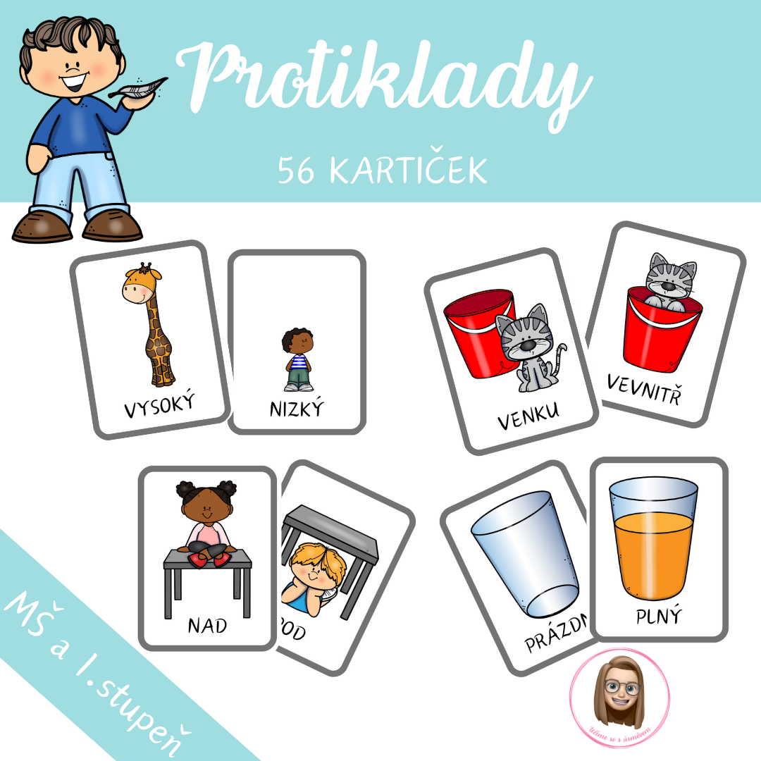 Soubor Antonyma – protiklady přináší 56 obrázkových karet (28 dvojic) určených pro hravé seznamování s protiklady. Děti si pomocí názorných ilustrací a zábavných aktivit rozšiřují slovní zásobu, učí se chápat význam slov a jejich vzájemné vztahy, rozvíjejí logické myšlení i schopnost vyjadřování.