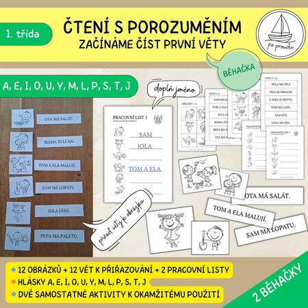 Tento materiál nabízí 12 jednoduchých vět a 12 obrázků, které děti propojují čtením, pohybem a porozuměním textu. Součástí jsou také 2 pracovní listy, díky kterým si žáci upevní jména postav a procvičí psaní.