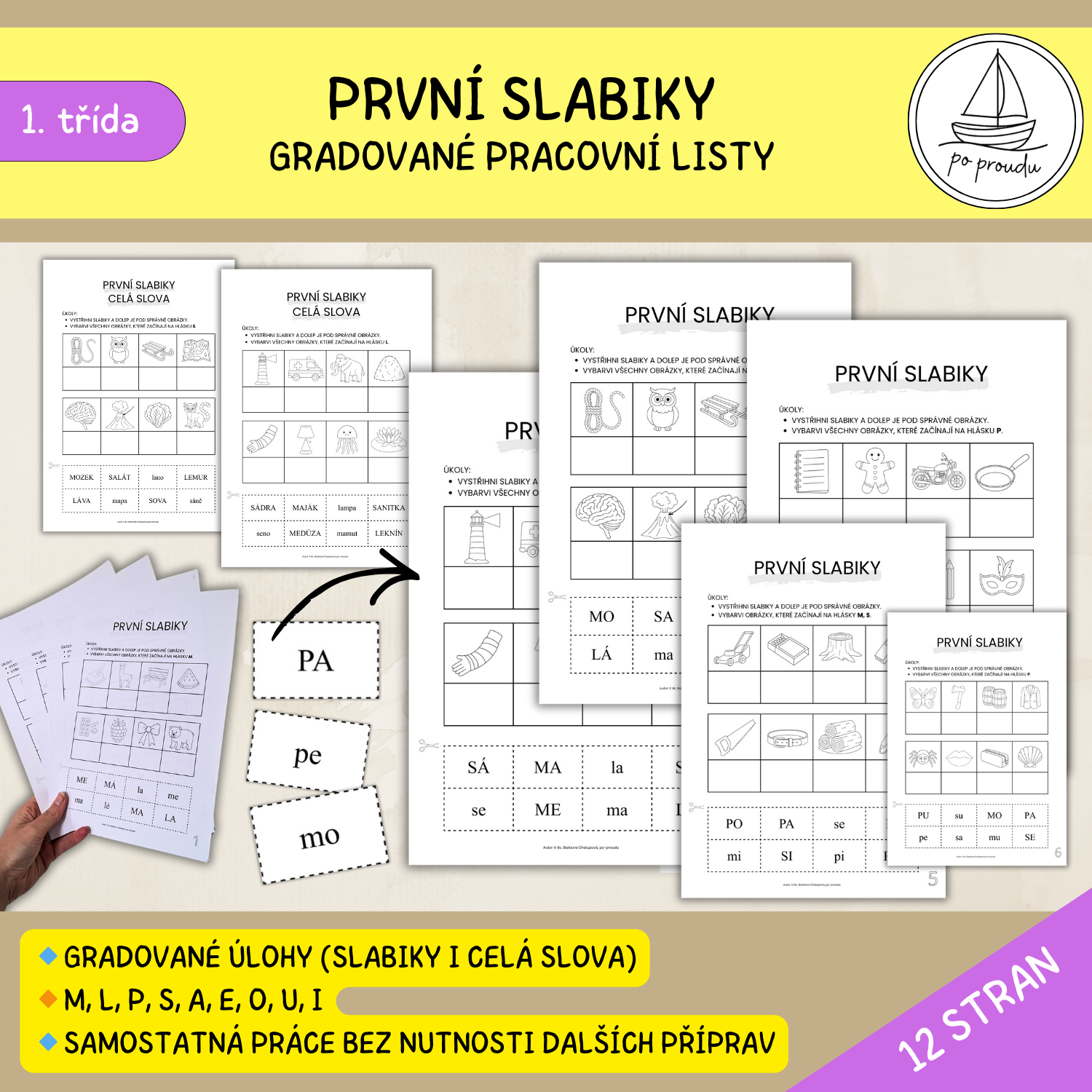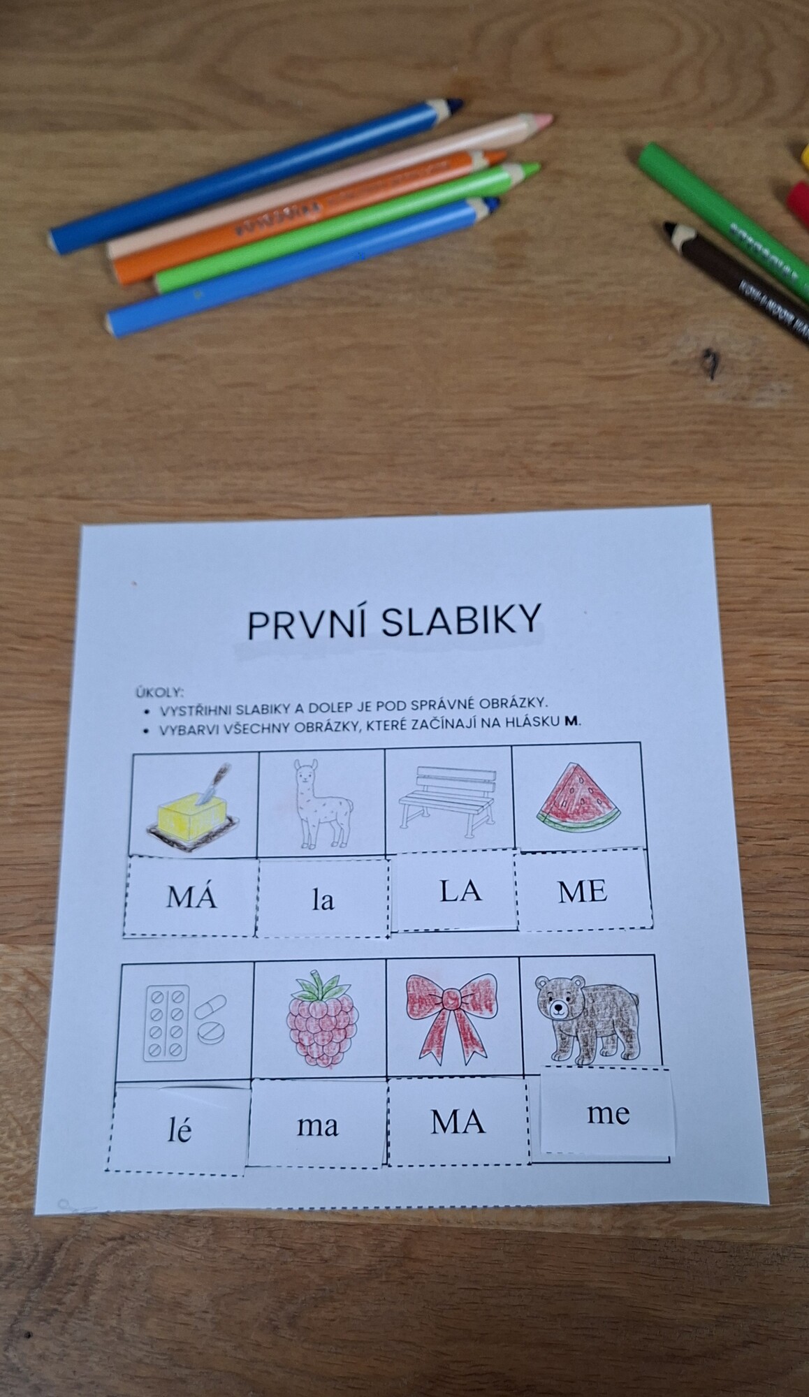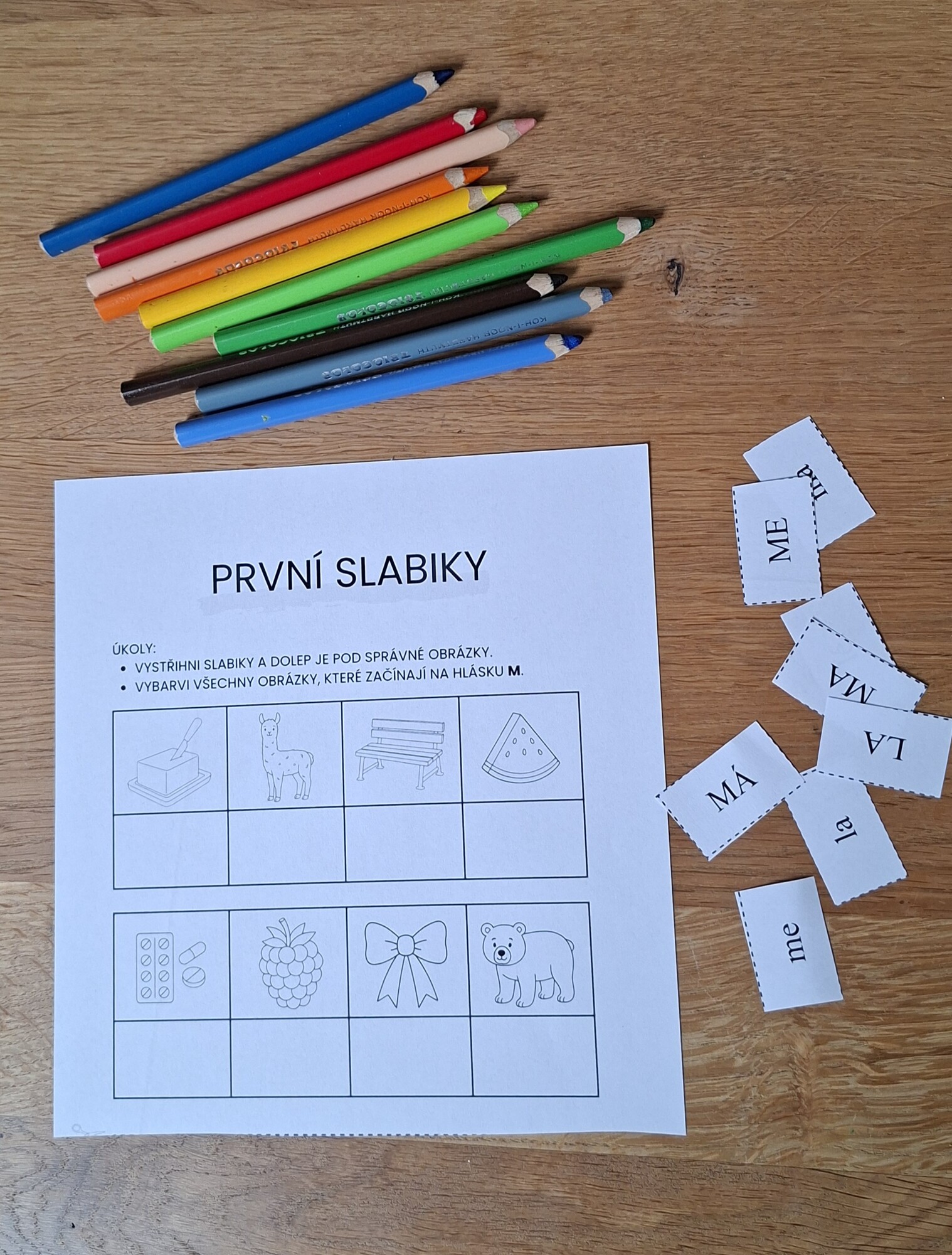 - Slabiky a slova jsou připravena ve spodní části listu k vystřižení, takže děti přirozeně rozvíjejí i jemnou motoriku – stříhání, manipulaci a přesné lepení.