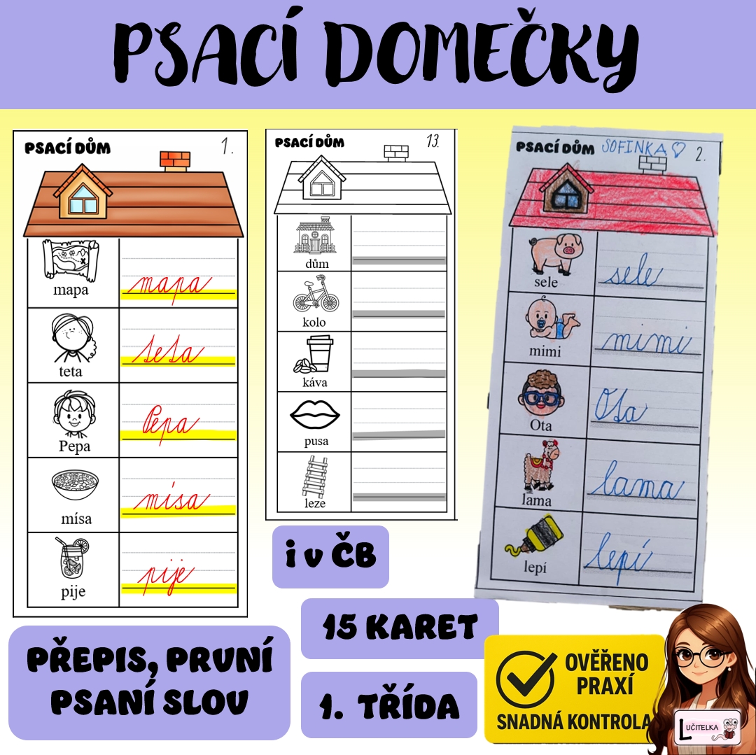 Cílem materiálu je procvičit si první přepis slov. Jedná se o soubor 15 sloupečků, kde na každém najdete 5 obrázků a pět slov. Žáci mají za úkol slova přečíst a přepsat na vedlejší řádky. Doporučuji dětem první přepis ukázat na tabuli. Přepis začínají na žlutém řádku. Kartičky slouží i k přepisu slov do sešitu, kdy žáci opakují psaní i úpravu. Celé archy lze také využít jako práci na doma nebo jako testíky/pětiminutovky, pokud si je rozstříháte. V každém domečku najdete vždy jméno a jednoslabičné slovo. V materiálu najdete i černobílou variantu, kterou lze využít i jako omalovánku. Součástí jsou i přehledné domečky se správným přepisem, které můžete využít pro snadnou kontrolu (mohou žáci kontrolovat i sami).