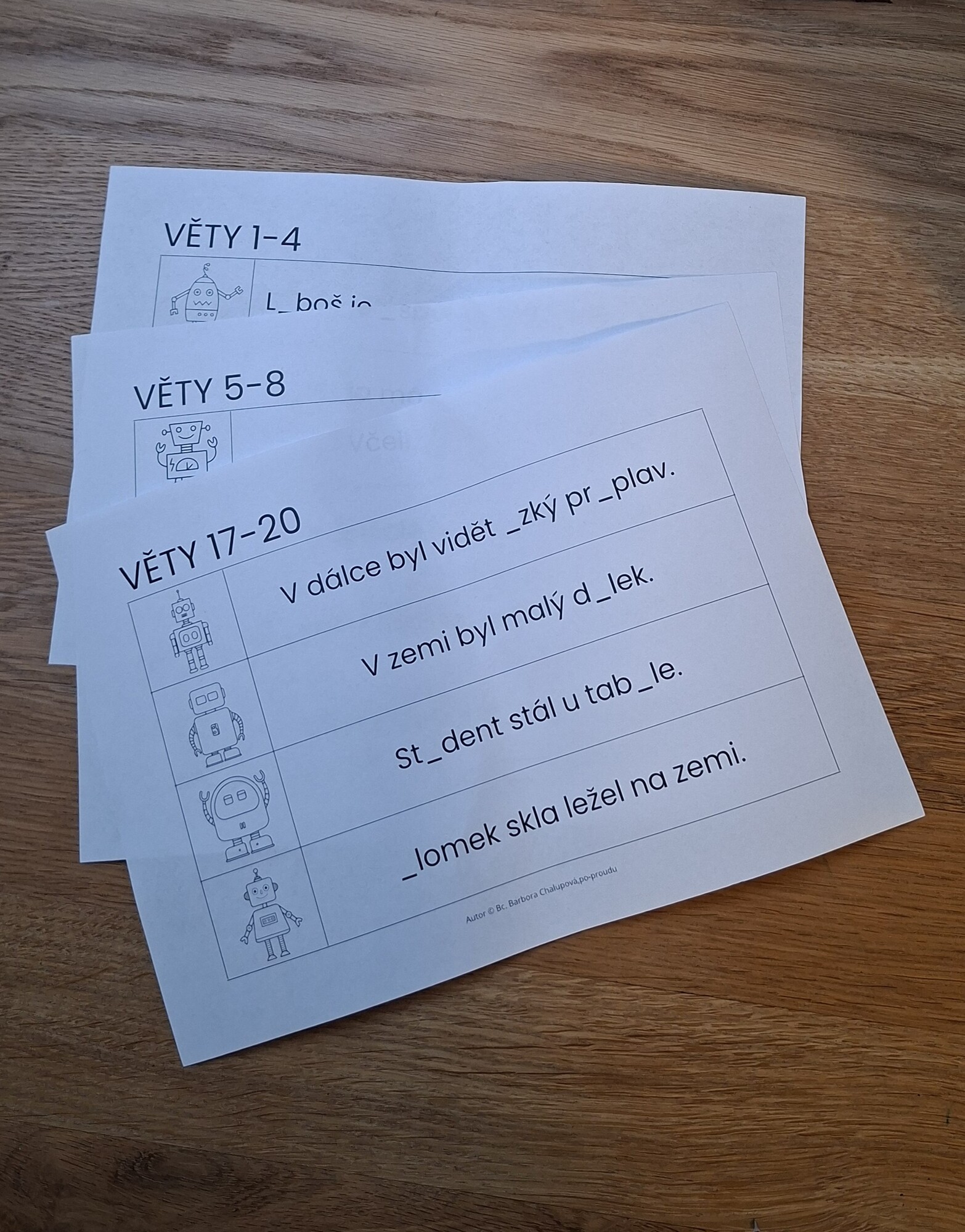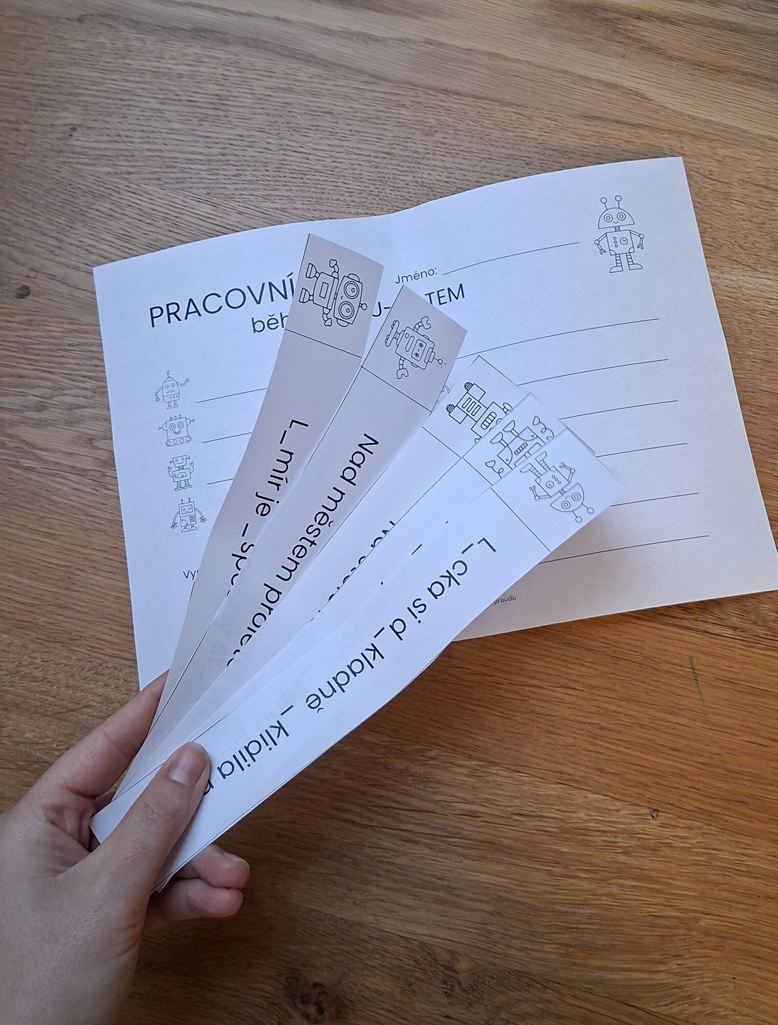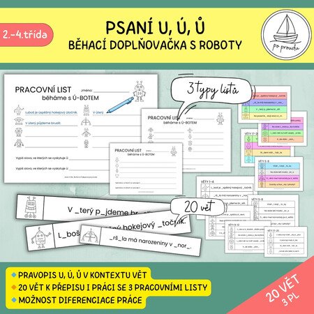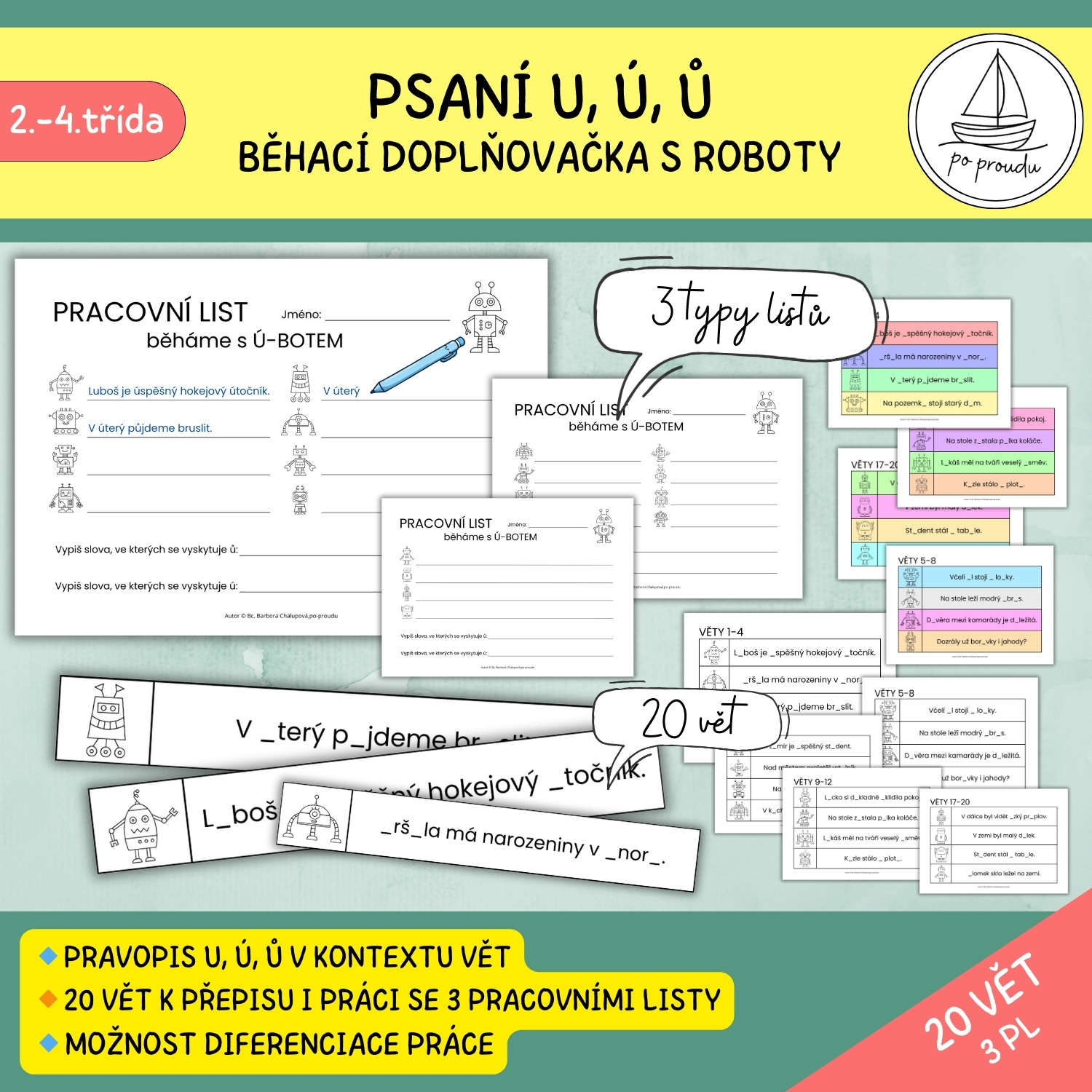 Hravé procvičení pravopisu, které propojuje pohyb, čtení a psaní. Tento materiál nabízí zábavnou formu procvičování pravopisu u, ú, ů v celých větách. Žáci se během práce aktivně pohybují po prostoru, čtou věty, přemýšlí nad významem slov a zapisují správné tvary. Celým materiálem je provází roboti, kteří dětem pomáhají s orientací v úkolech a zvyšují jejich motivaci.