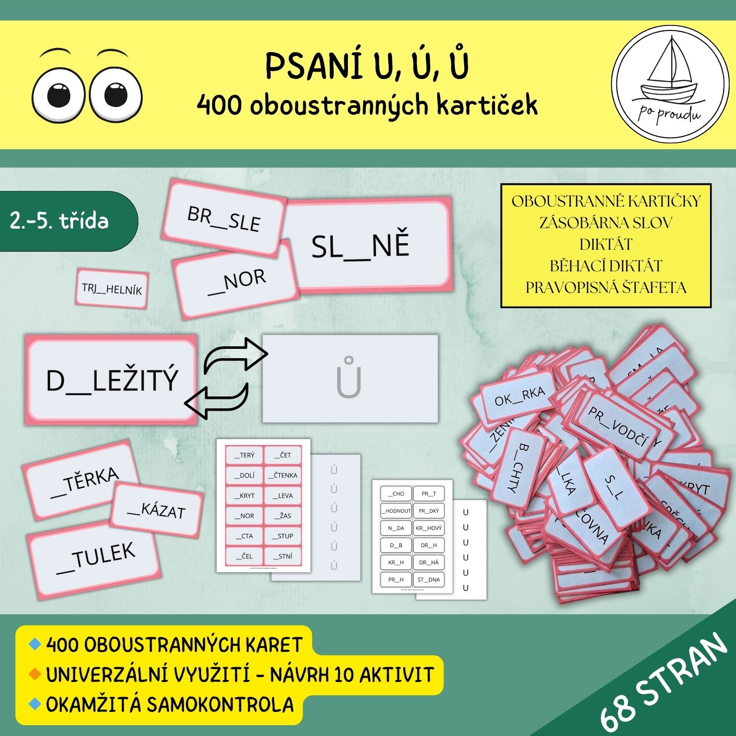 - 400 oboustranných kartiček (u/ú/ů v různých pozicích, včetně výjimek a přejatých slov).