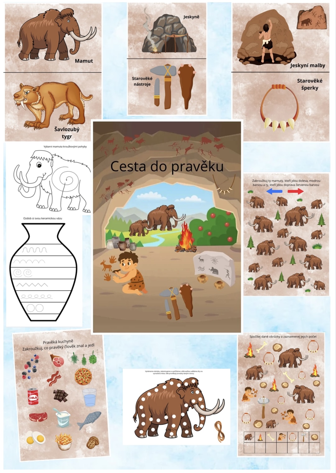 Výtvarné a pracovní činnosti (tvoření pasu, kreslení, výroba helmy, malby do jeskyně).