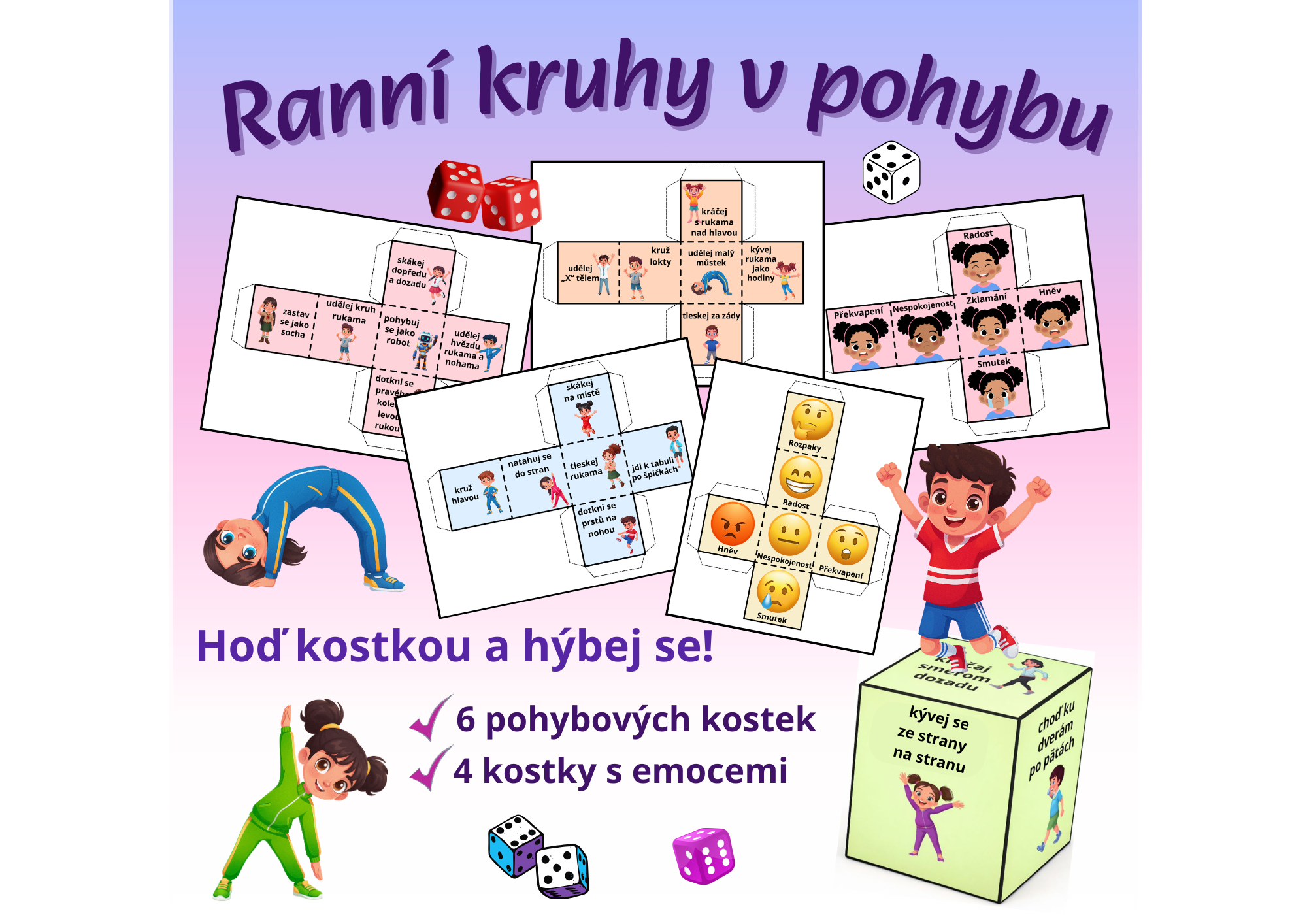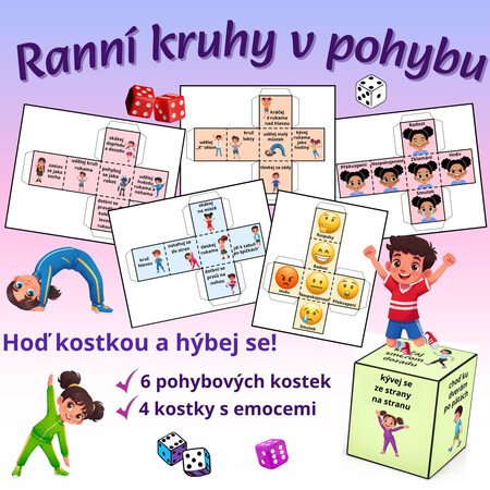 Pohybové ranní kruhy jsou sada 6 pohybových kostek a 4 kostek s emocemi, které slouží jako hravá pomůcka pro žáky na 1. stupni ZŠ.
