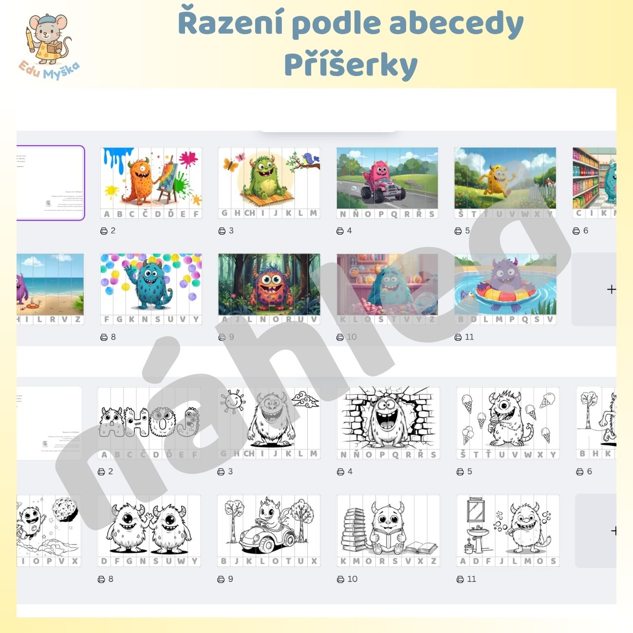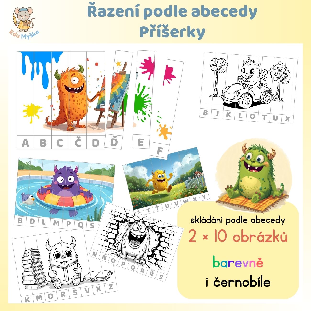 Soubor obsahuje 10 barevných a 10 černobílých obrázků rozdělených mřížkou. Na jejich okraji jsou písmena abecedy. Obrázky je potřeba podle čar rozstříhat, žáci je pak podle abecedy mají srovnat. Vznikne jim tak obrázek.