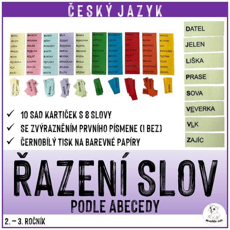 - 10 sad kartiček s 8 slovy k řazení podle abecedy