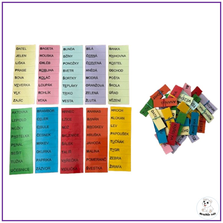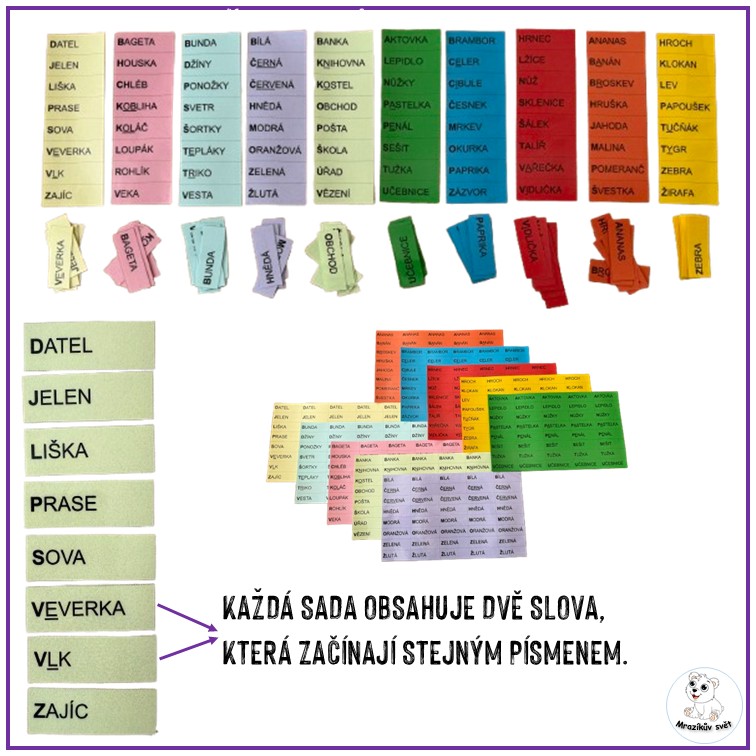- sada 1-10 = stejné sloupce slov na stránce – doporučuji tisk na barevný papír pro vytvoření různých sad a popsání kartiček (permanentním fixem) z jednoho sloupce stejným znakem (např. číslicí)