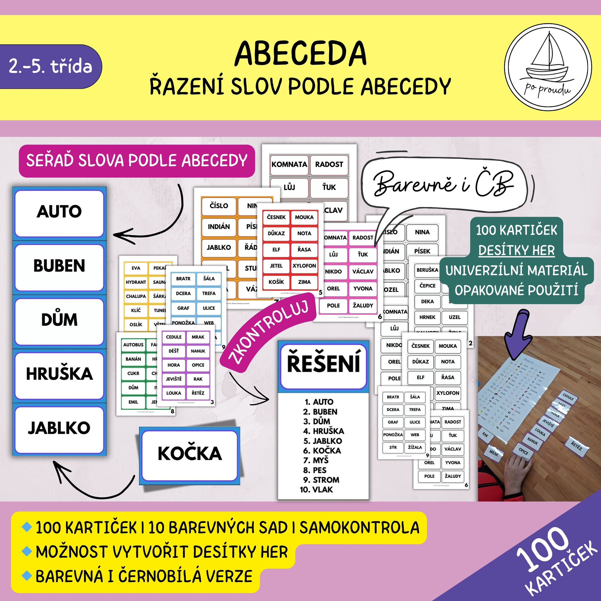 Tento materiál nabízí 10 sad kartiček po 10 slovech (celkem 100 kartiček), se kterými žáci řadí slova podle abecedy, kombinují je a pracují s nimi v různých úrovních obtížnosti.