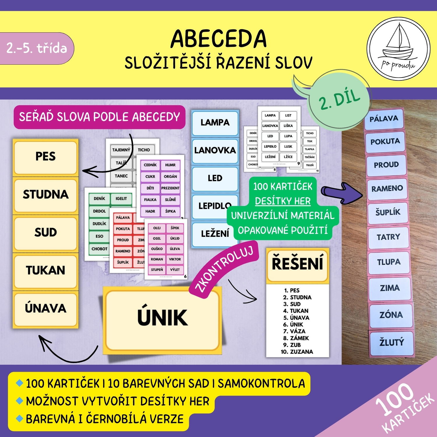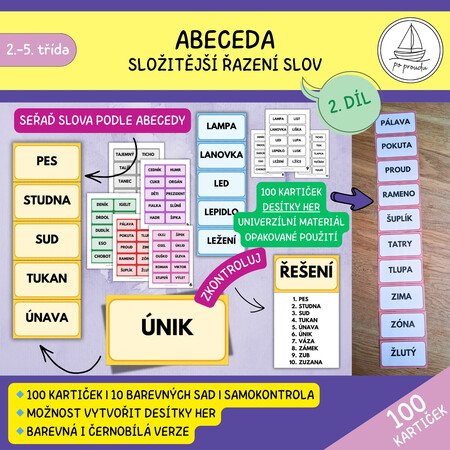 Univerzální materiál obsahuje 100 kartiček, desítky her a pestré využití. Druhý díl se zaměřuje na složitější řazení slov podle abecedy. ✨
