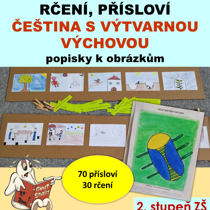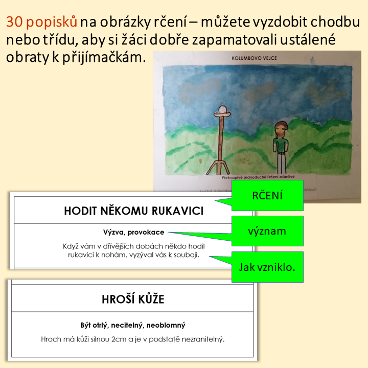 - Soubor 30 rčení s informací o tom, co znamenají a jak vznikla. Žáci namalují velký obrázek, na který přilepí popisky a vystaví na chodbě. Všímavý deváťák se tak nevědomky chystá k přijímačkám.