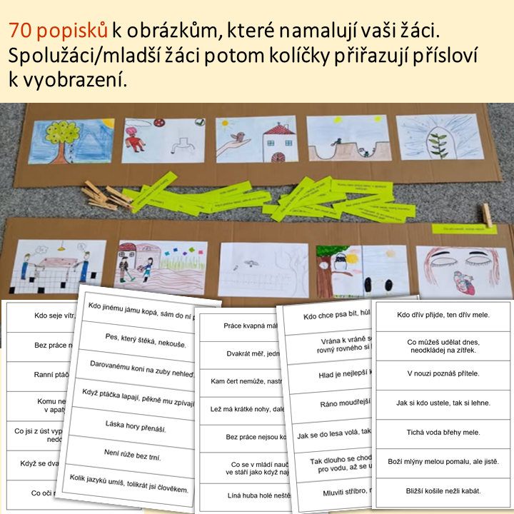 - 70 přísloví. Nastříhejte lístky s příslovím, laminujte. Žáci namalují obrázky, potom přiřazují popisky. Děti práce baví, ale zároveň si připomínají ustálené obraty, které jim tak často činí potíže. Můžete také nabídnout mladším dětem na 1. stupni.