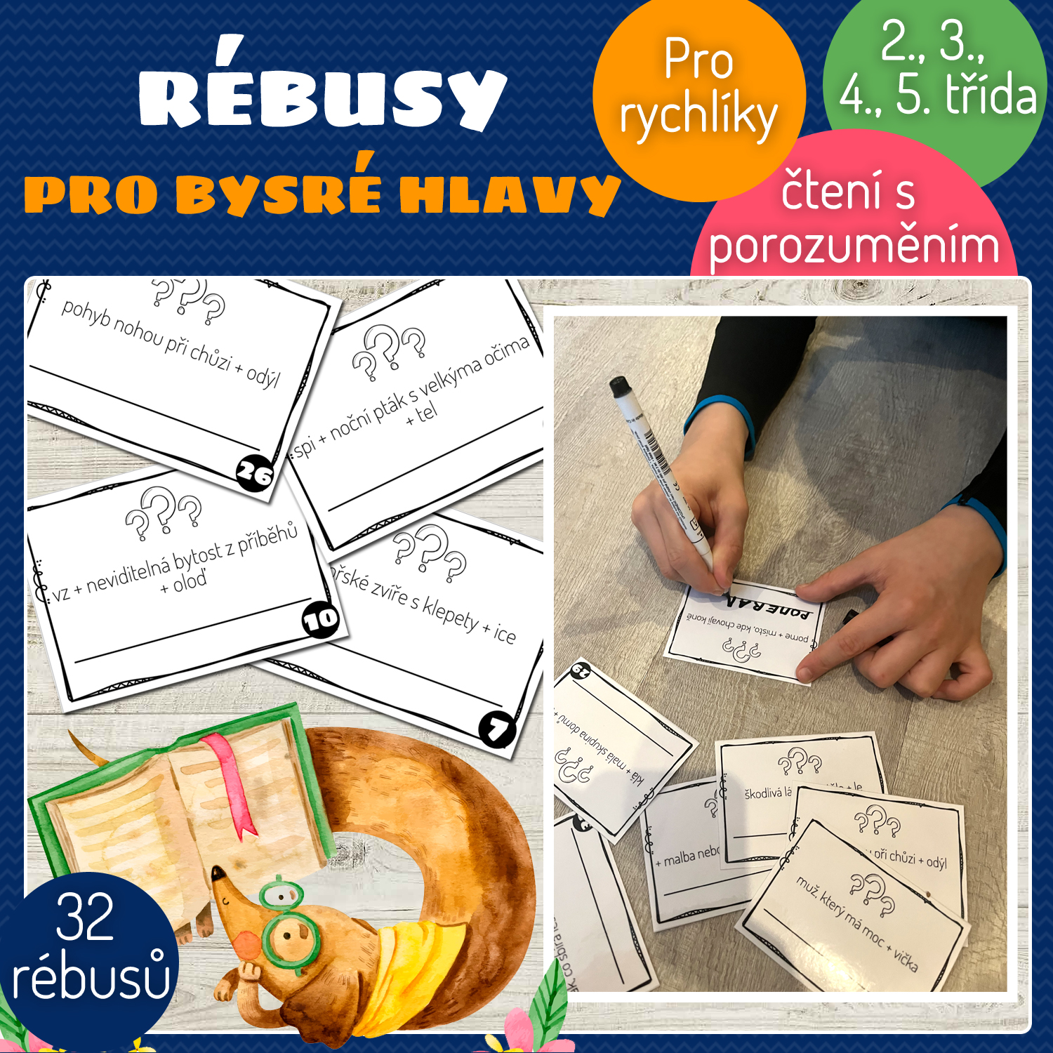 Materiál obsahuje 32 rébusů. Slouží k procvičení čtení s porozuměním.