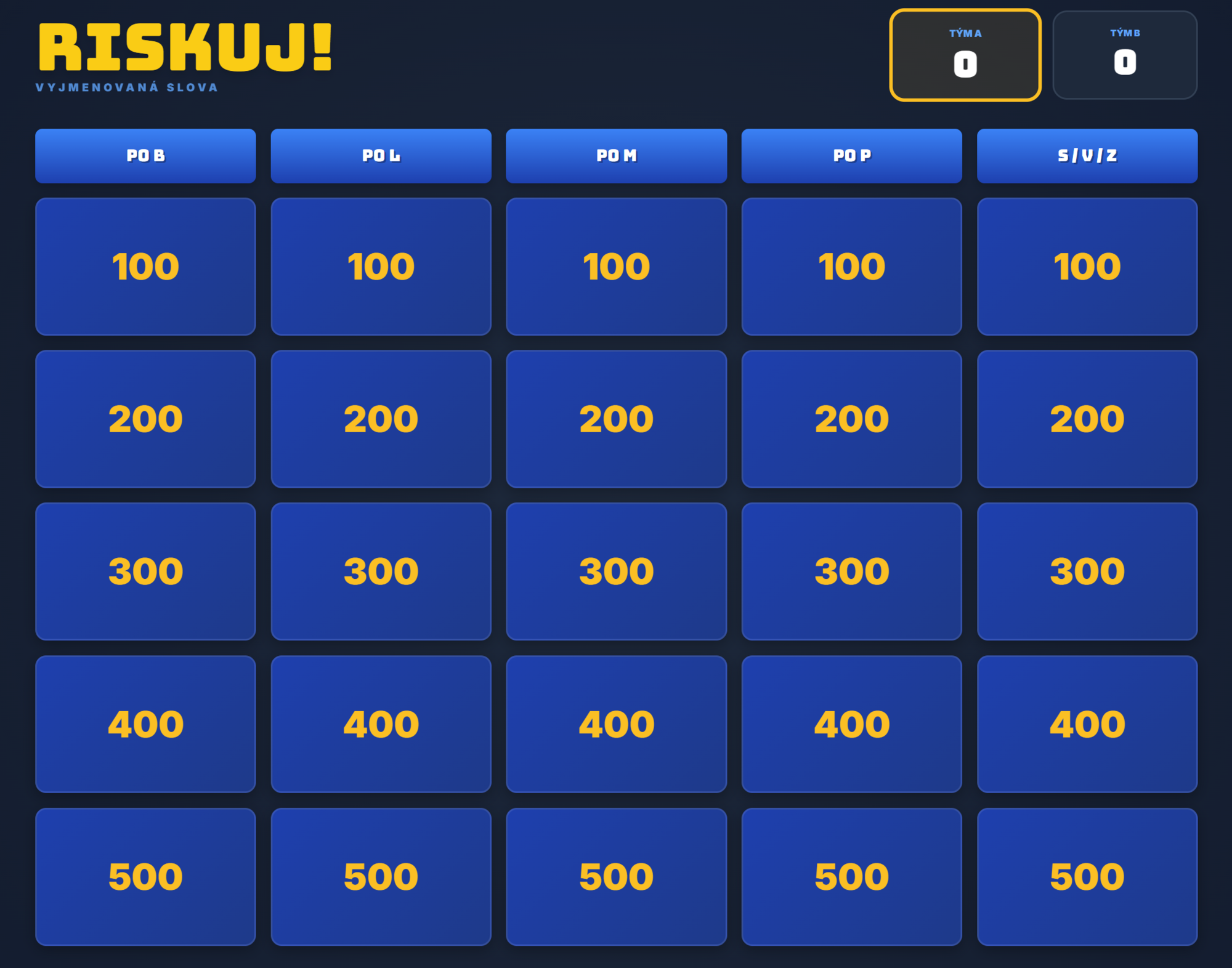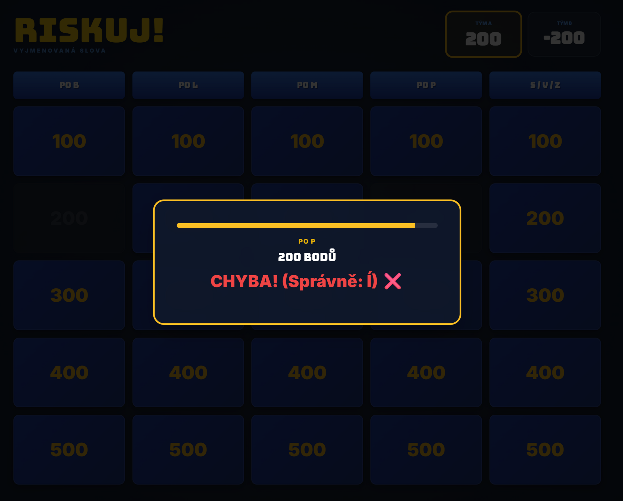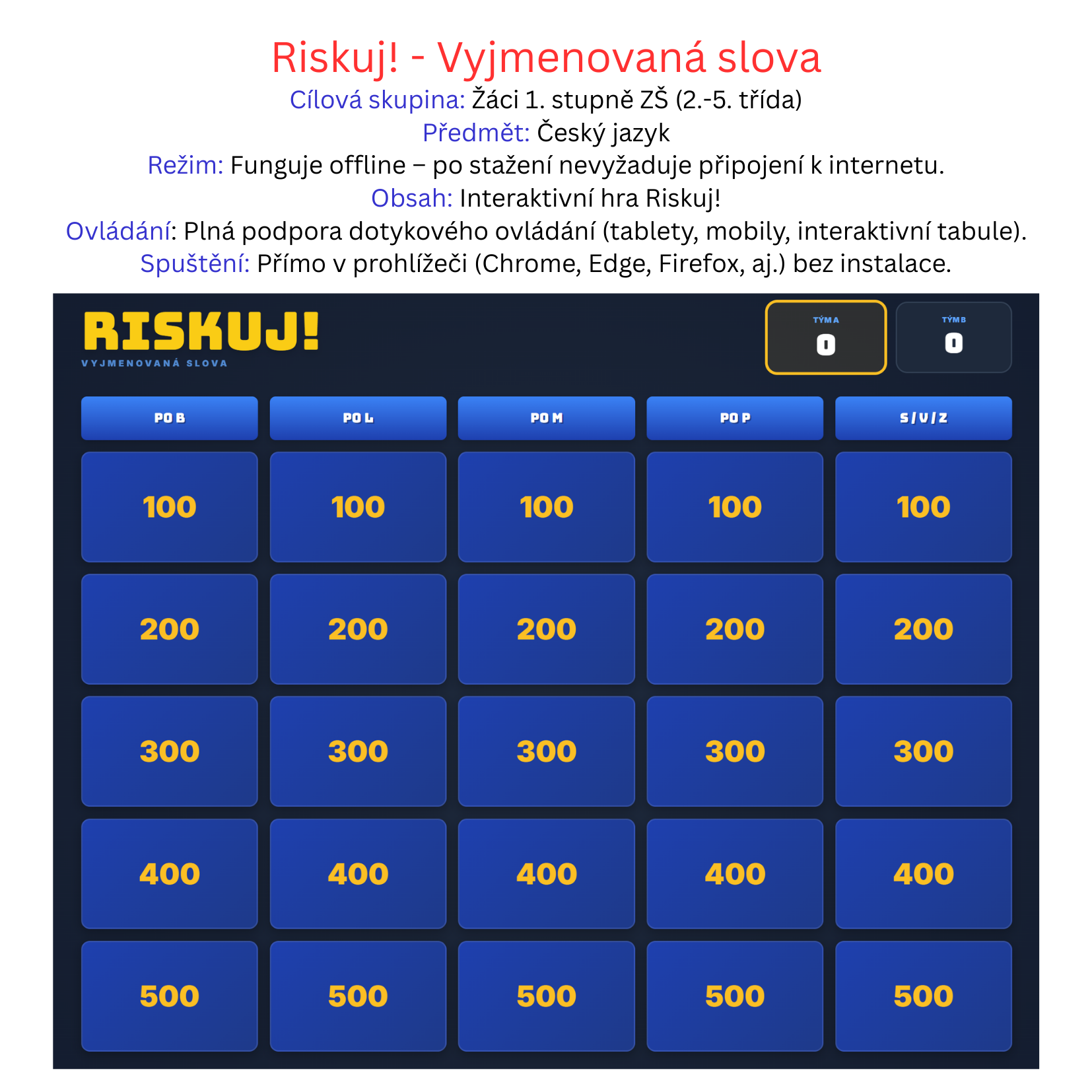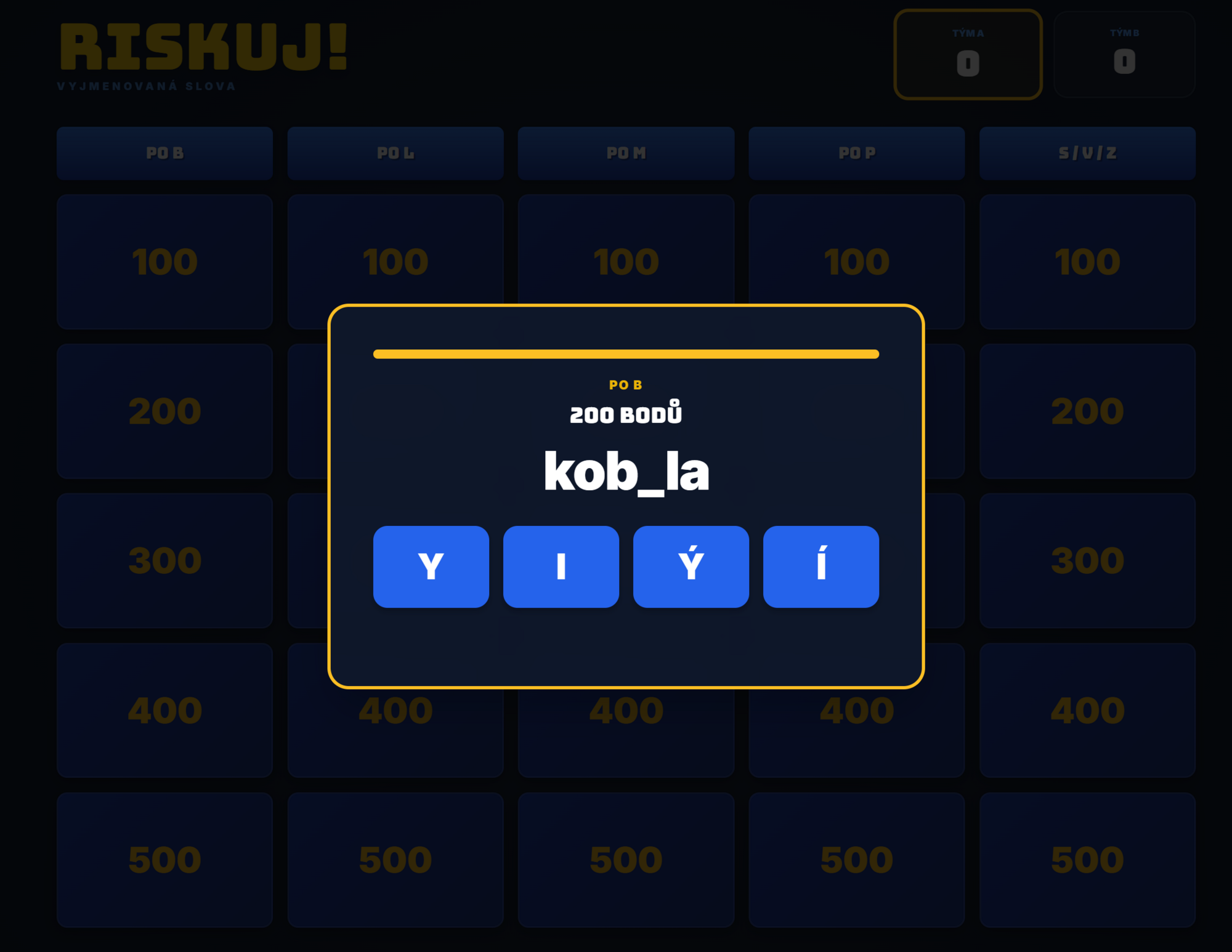 Jedná se o interaktivní digitální vzdělávací hru založenou na principu populární soutěže, která slouží k zábavnému procvičování vyjmenovaných slov. Žáci jsou rozděleni do dvou týmů (A a B), které proti sobě soutěží v doplňování správného i/y po obojetných souhláskách.