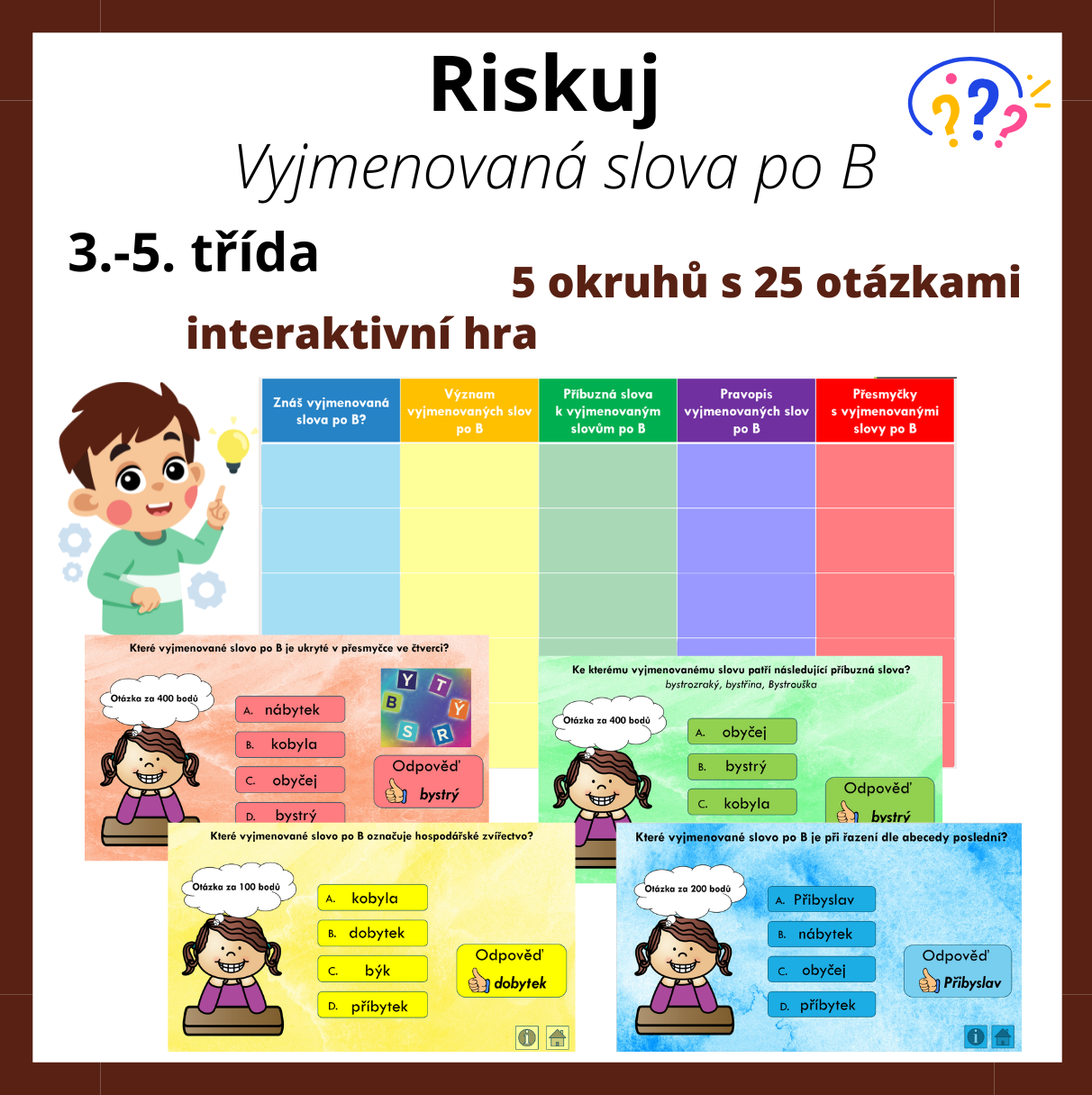 • Žáci si kromě řady vyjmenovaných slov, zopakují jejich význam, příbuzná slova pravopis a v neposlední řadě vyřeší přesmyčky a odkryjí schované vyjmenované slovo po B. Některé otázky také vyžadují znalost abecedy.