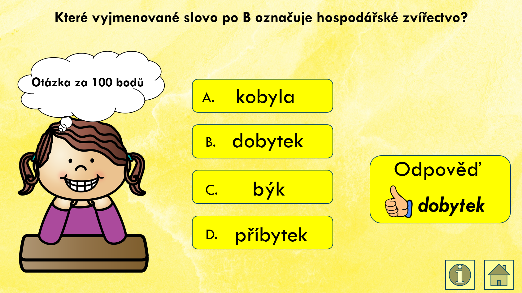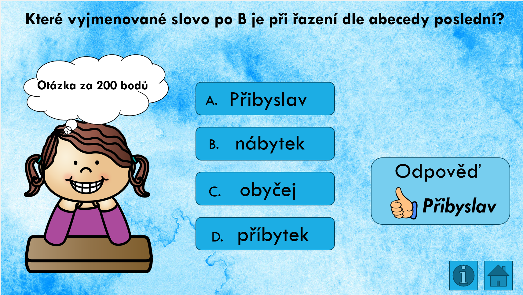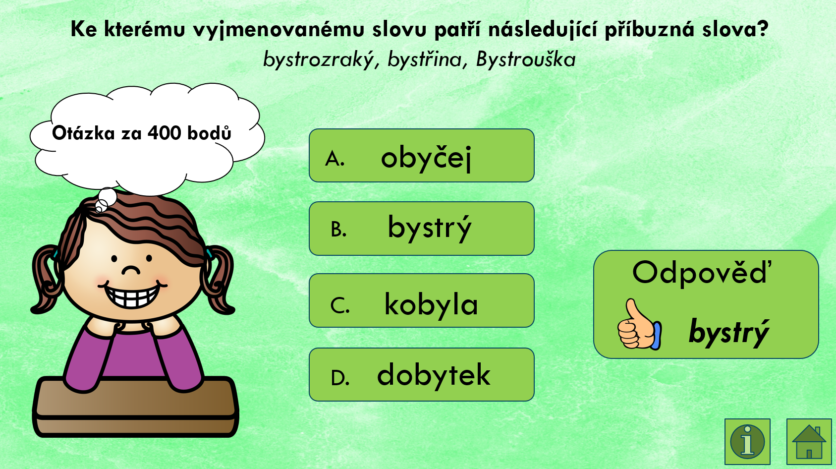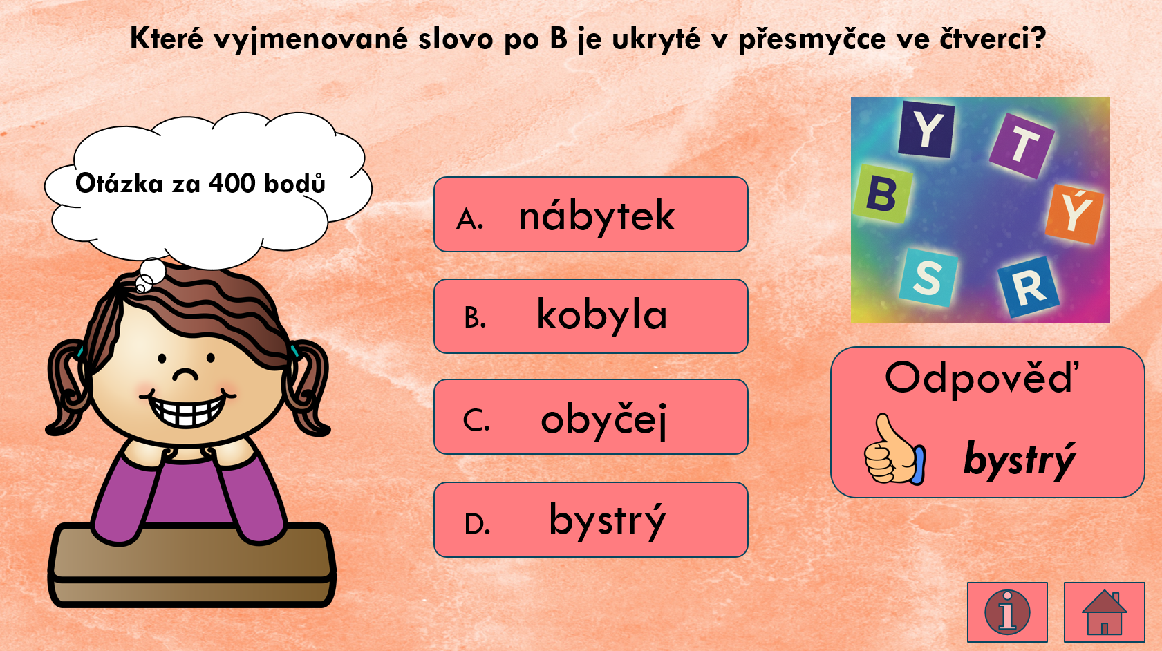 •Tým si vybere otázku (např. „Znáš vyjmenovaná slova po B za 400“).
