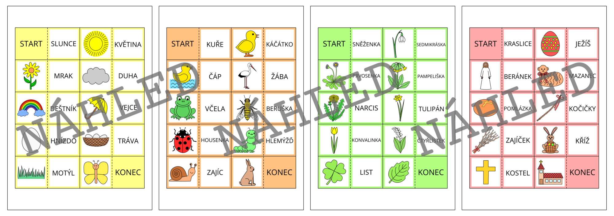 Materiál JARO A VELIKONOCE – DOMINO S OBRÁZKY A SLOVY obsahuje čtyři strany s kartičkami domina.