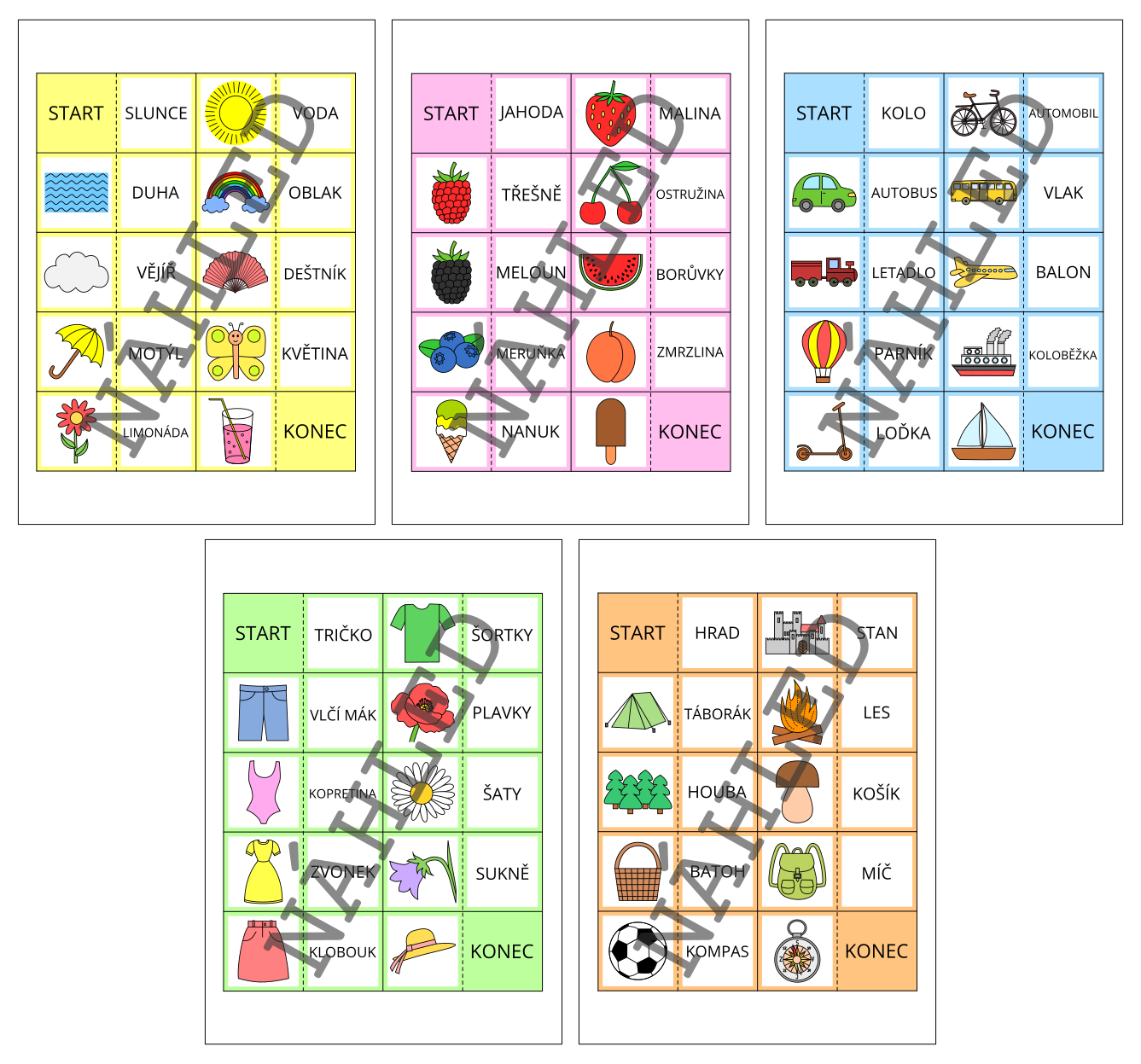 Strany s kartičkami vytiskněte a rozstříhejte. Kartičky můžete zalaminovat. Úkolem je přiložit ke slovům správný obrázek tak, aby vznikl souvislý řetěz/had. Hra začíná kartičkou se slovem START.