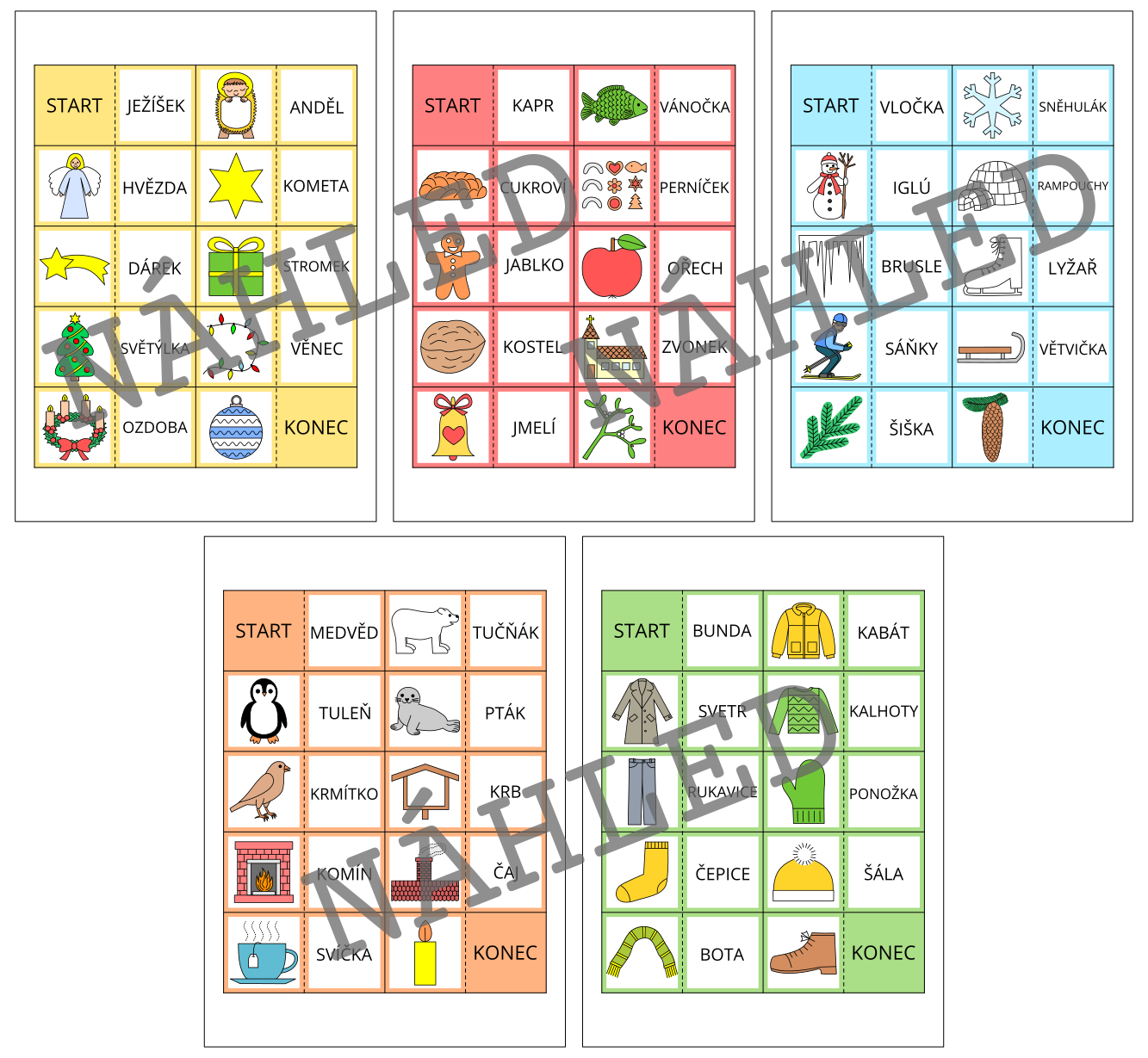 Materiál VÁNOCE A ZIMA – DOMINO S OBRÁZKY A SLOVY obsahuje pět stran s kartičkami domina.