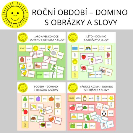 Soubor 4 materiálů, které obsahují domina s obrázky a slovy. Tématem je jaro, Velikonoce, léto, podzim, zima a Vánoce.