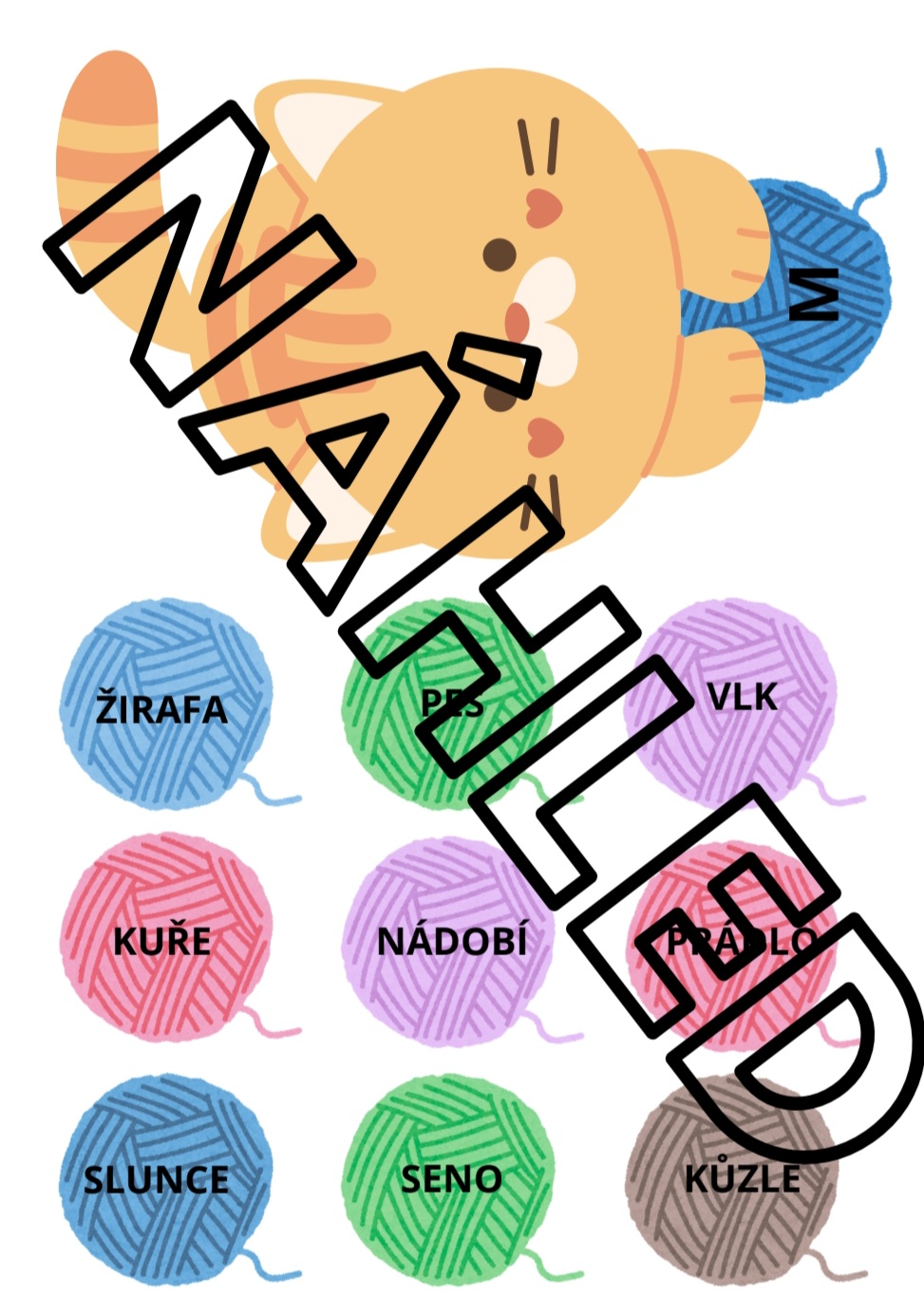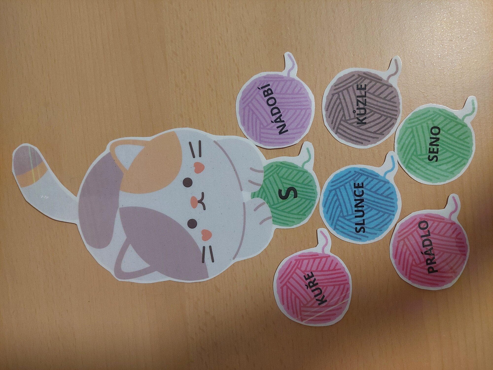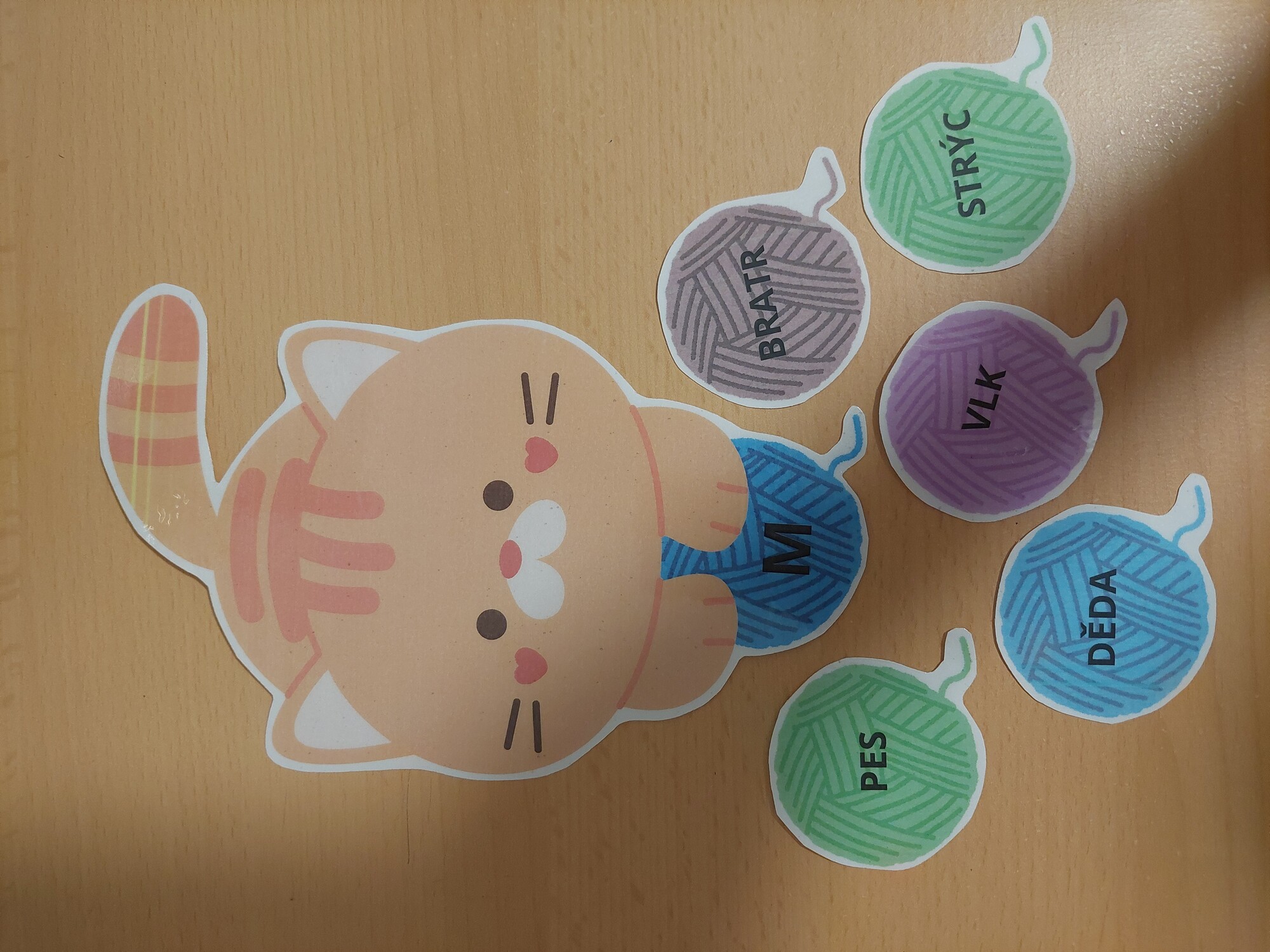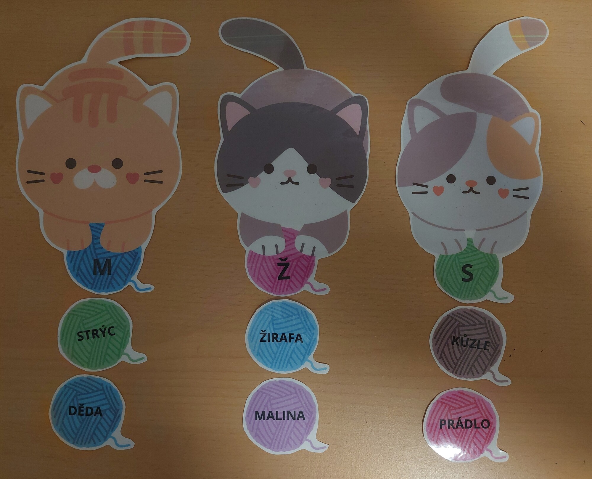 Tři kočičky si spolu hrály s klubíčky. Klubíčka se ale pomíchala. Pomoz jim je zase správně rozdělit. Na každém klubíčku je napsané jedno slovo. Kočičkám je rozdělíš podle rodu slov: