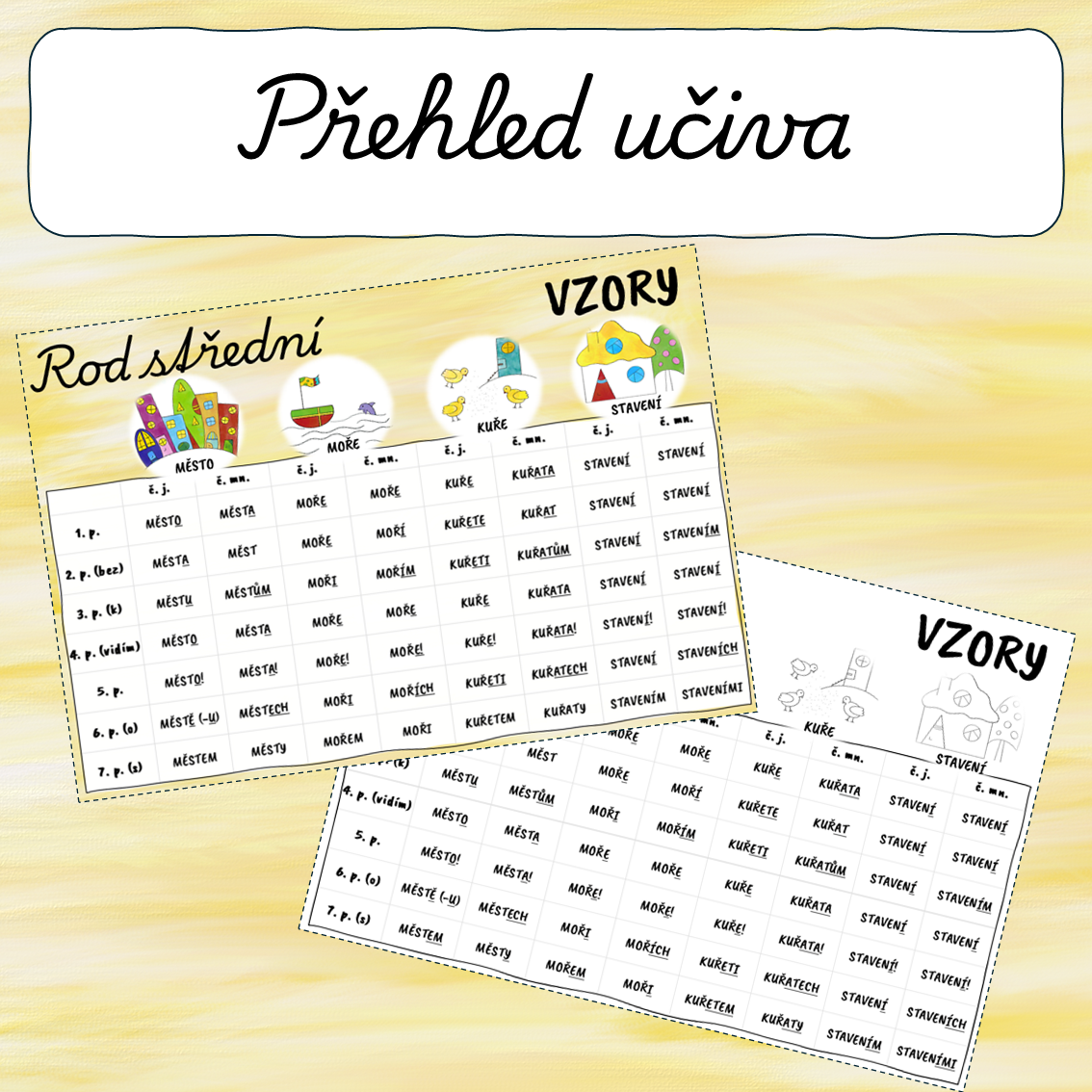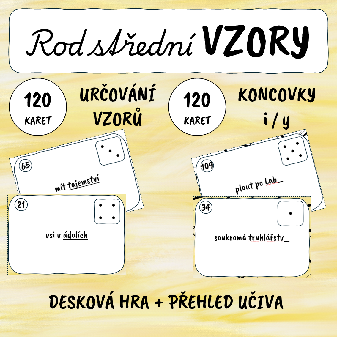 Na kartách naleznete podstatná jména rodu středního použita v krátkých slovních spojeních tak, aby se žáci učili rozpoznat vzory těchto podst. jmen a určit koncovky v různých pádech a číslech.