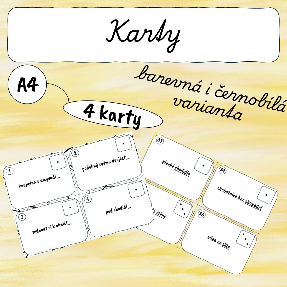 Každý karta obsahuje kromě slovního spojení také číselné označení, které slouží k vyhledání správné odpovědi v přiloženém klíči. Dále na kartě naleznete obrázek hrací kostky s hodnotou 1-6, díky které se žáci dozví, o kolik polí se mají v deskové hře posunout vpřed, pokud je jejich odpověď správná.