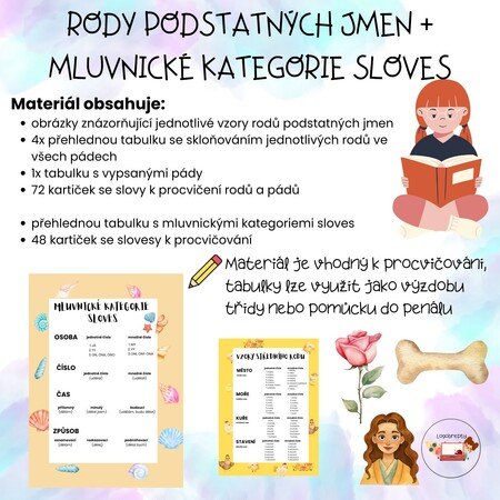 Tento soubor přináší názornou podporu při výuce gramatiky – zaměřuje se na rody a pády podstatných jmen i mluvnické kategorie sloves.