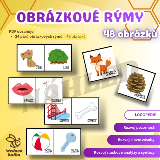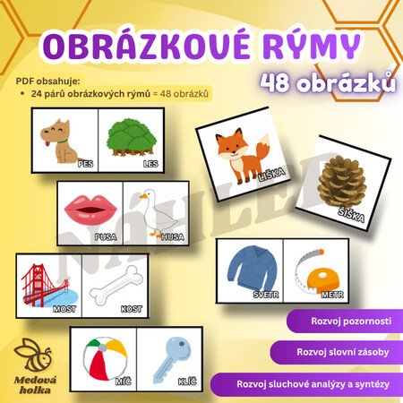 Materiál podporuje rozvoj sluchové analýzy, koncentrace a rozšiřování slovní zásoby. Práce s rýmy zároveň vytváří přirozený most k pozdějším dovednostem souvisejícím se čtením a psaním.
