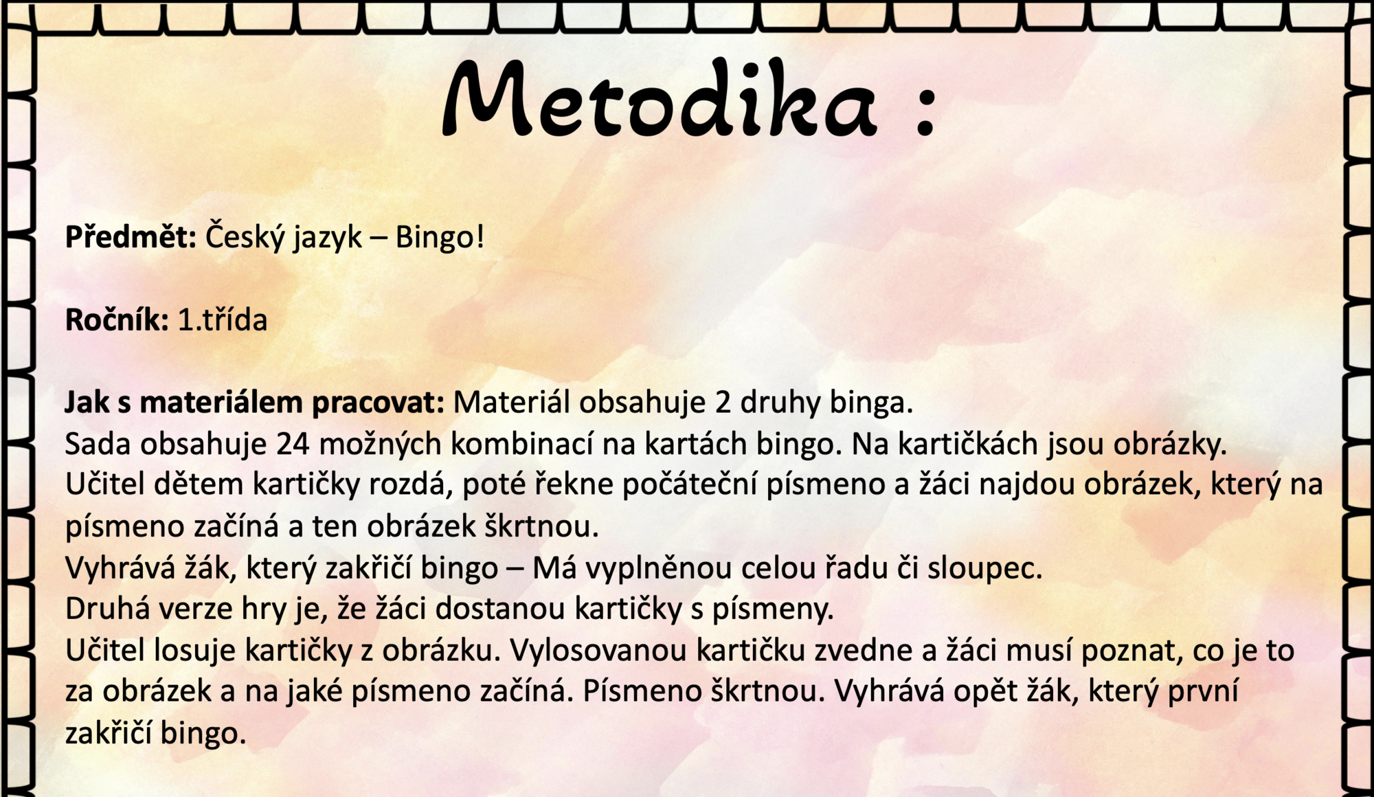 Učitel losuje kartičky z obrázku. Vylosovanou kartičku zvedne a žáci musí poznat, co je to za obrázek a na jaké písmeno začíná. Písmeno škrtnou. Vyhrává opět žák, který první zakřičí bingo.