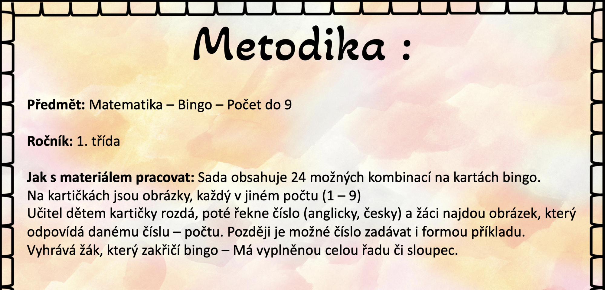 Sada obsahuje 24 možných kombinací na kartách bingo. Na kartičkách jsou obrázky.