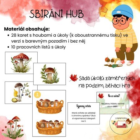 Vydejte se s dětmi na podzimní procházku lesem a nasbírejte co nejvíce hub! Každá houba v sobě ale skrývá úkol – někdy stačí odpovědět, jindy je třeba splnit krátkou aktivitu nebo vyřešit pracovní list.