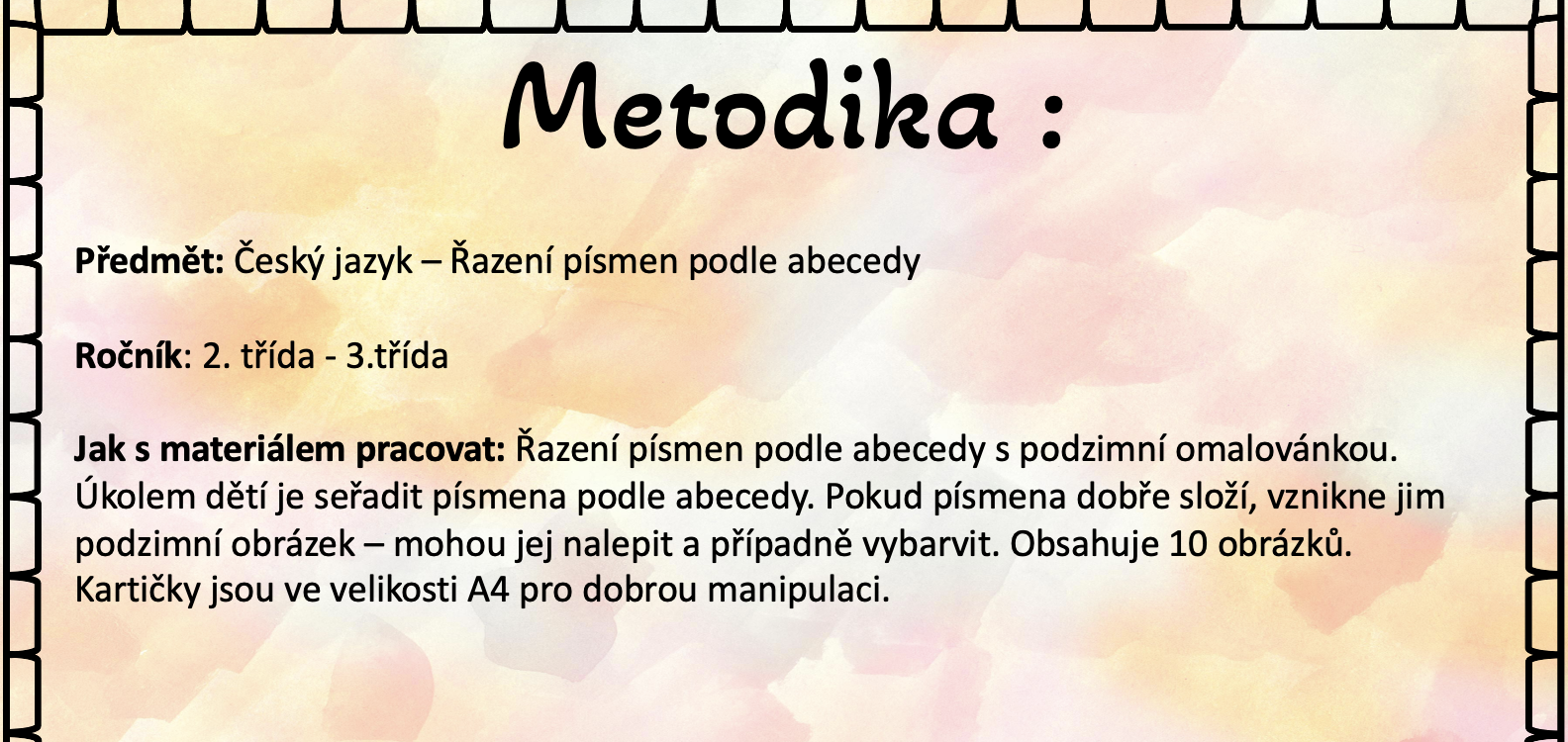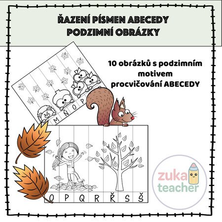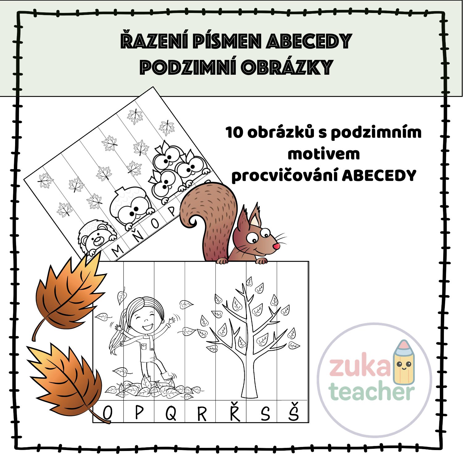 Řazení písmen podle abecedy s podzimní omalovánkou. Učitel jednotlivé obrázky nastříhá podle proužků. Úkolem dětí je seřadit písmena podle abecedy. Pokud písmena dobře složí, vznikne jim podzimní obrázek – mohou jej nalepit a případně vybarvit. Obsahuje 10 obrázků.