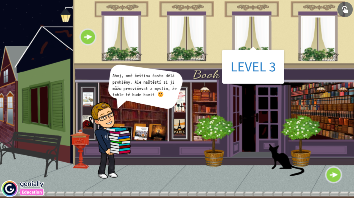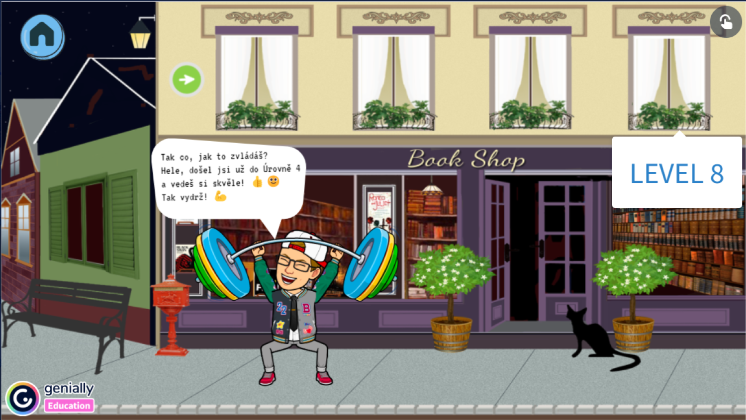 Odkazy na jednotlivé úrovně jsou skryté pod okny (obrázek knihkupectví - viz fotogalerie). Jakmile žák dokončí první 4 kola, bude plynule navazovat na podobnou obrazovku s knihkupectvím, kde pod okny jsou schovány další 4 odkazy na kola 5-8.