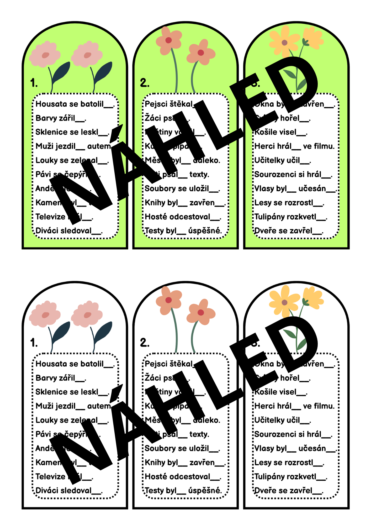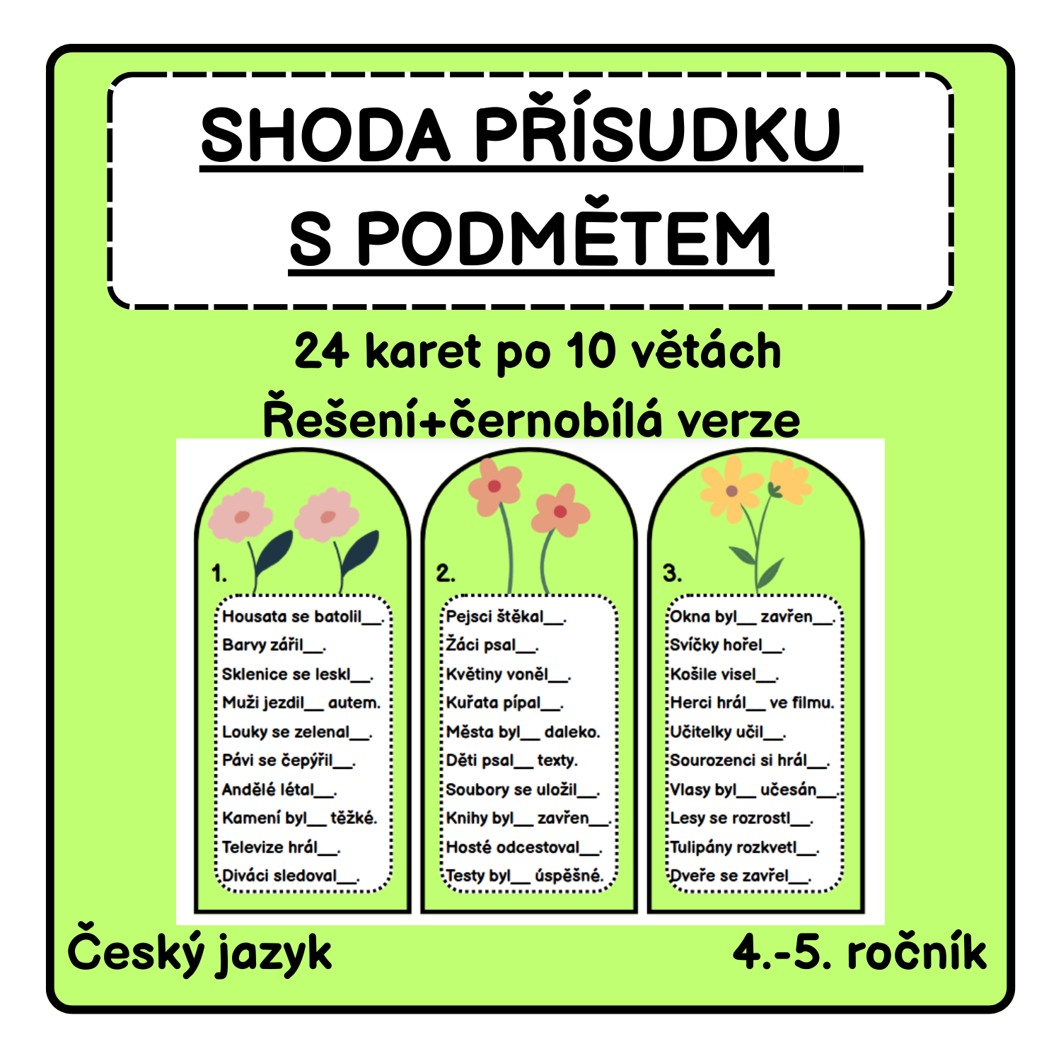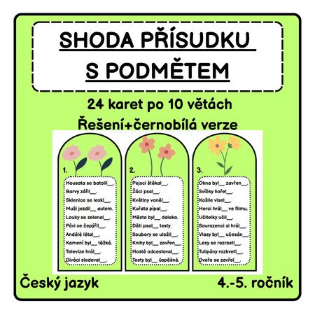 Tento materiál je zaměřený na procvičování pravopisu ve shodě přísudku s podmětem. Je vhodný do hodin českého jazyka především ve 4.-5. ročníku. Soubor obsahuje 24 kartiček k doplňování koncovek v přísudku věty. K dispozici je i černobílá varianta a ŘEŠENÍ.