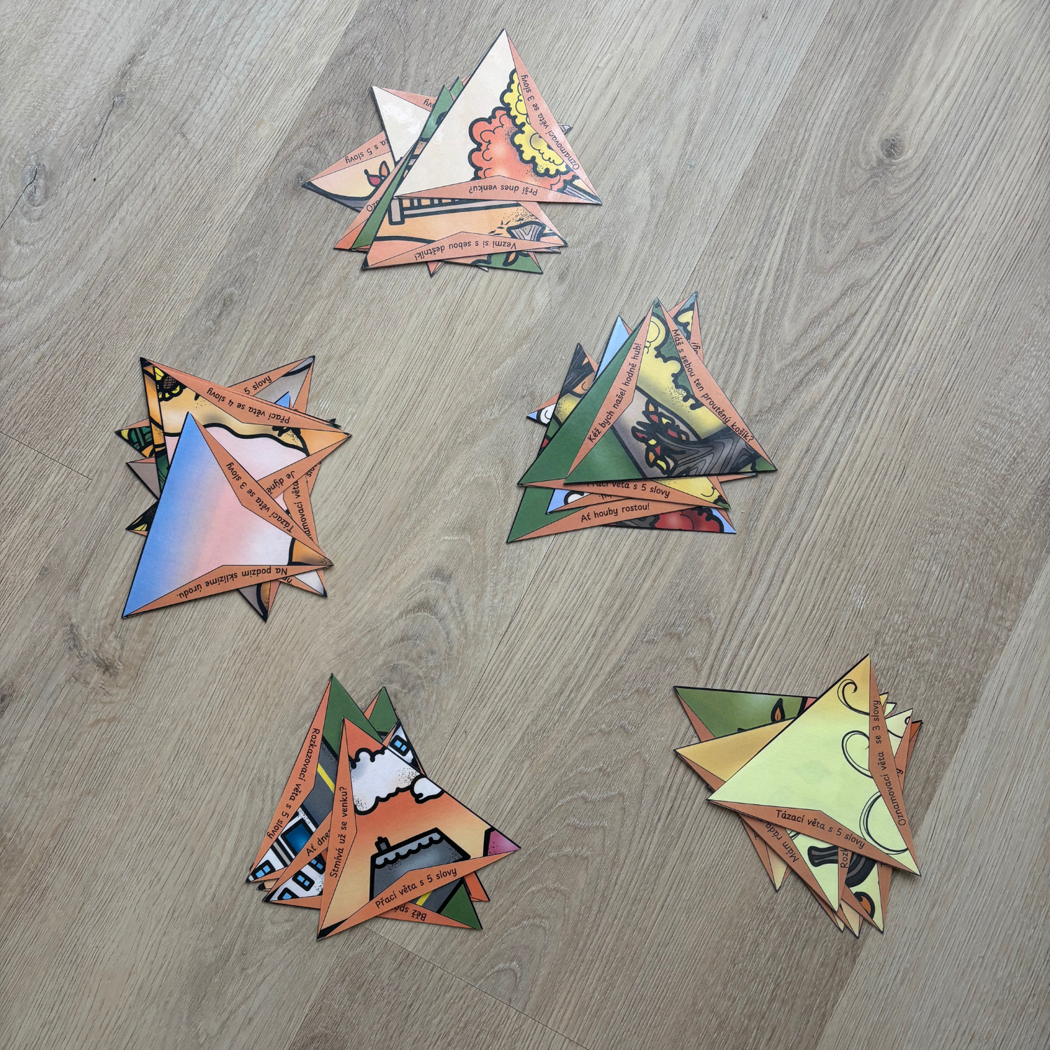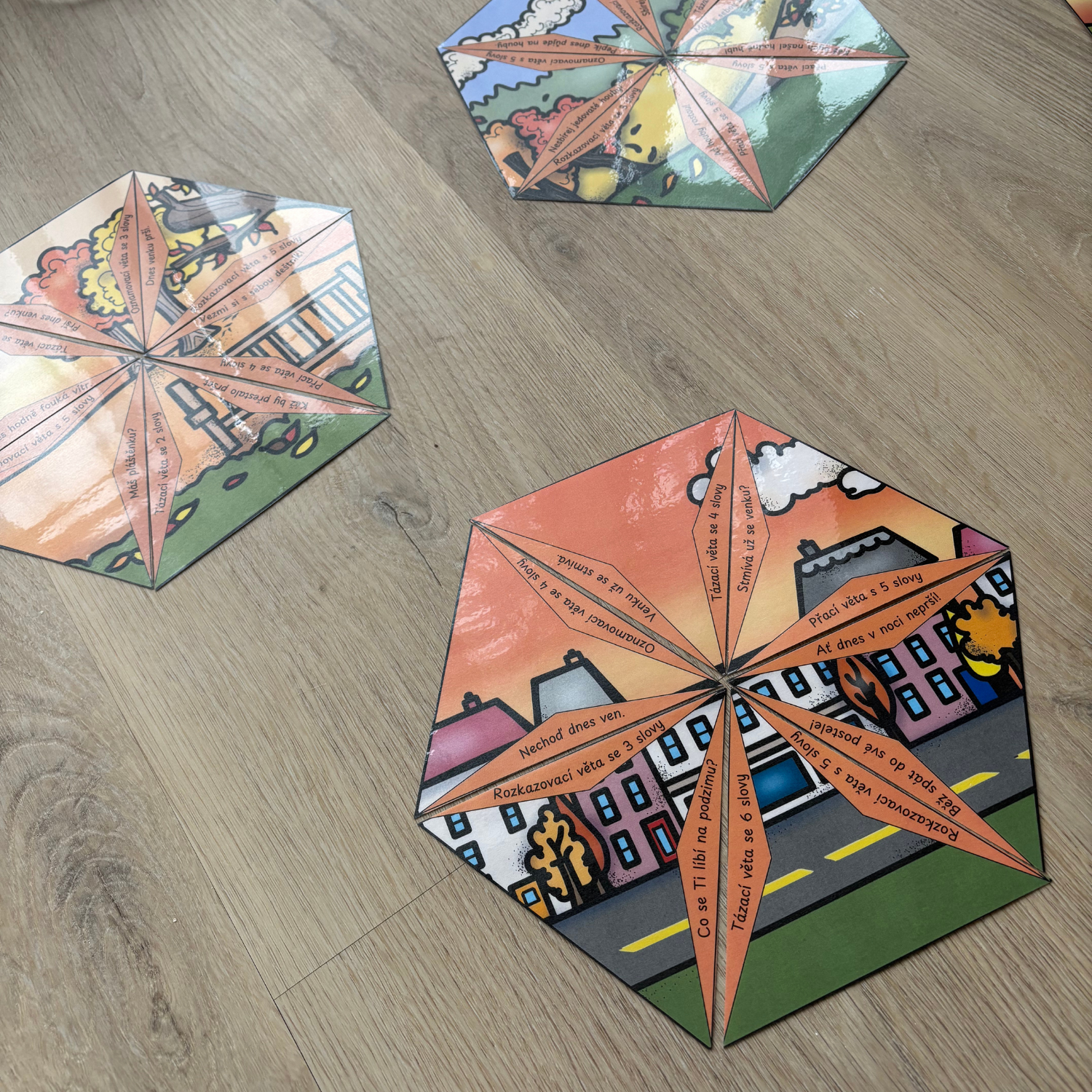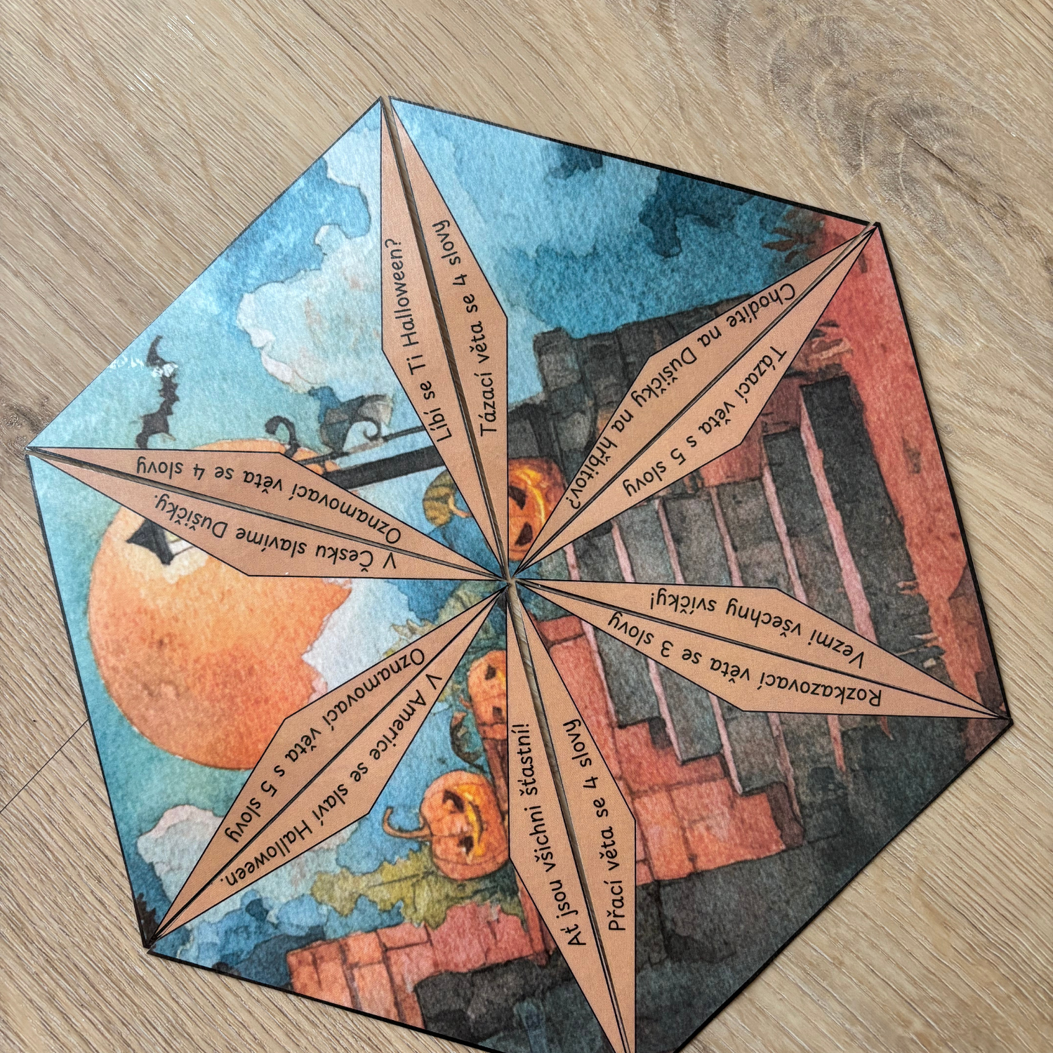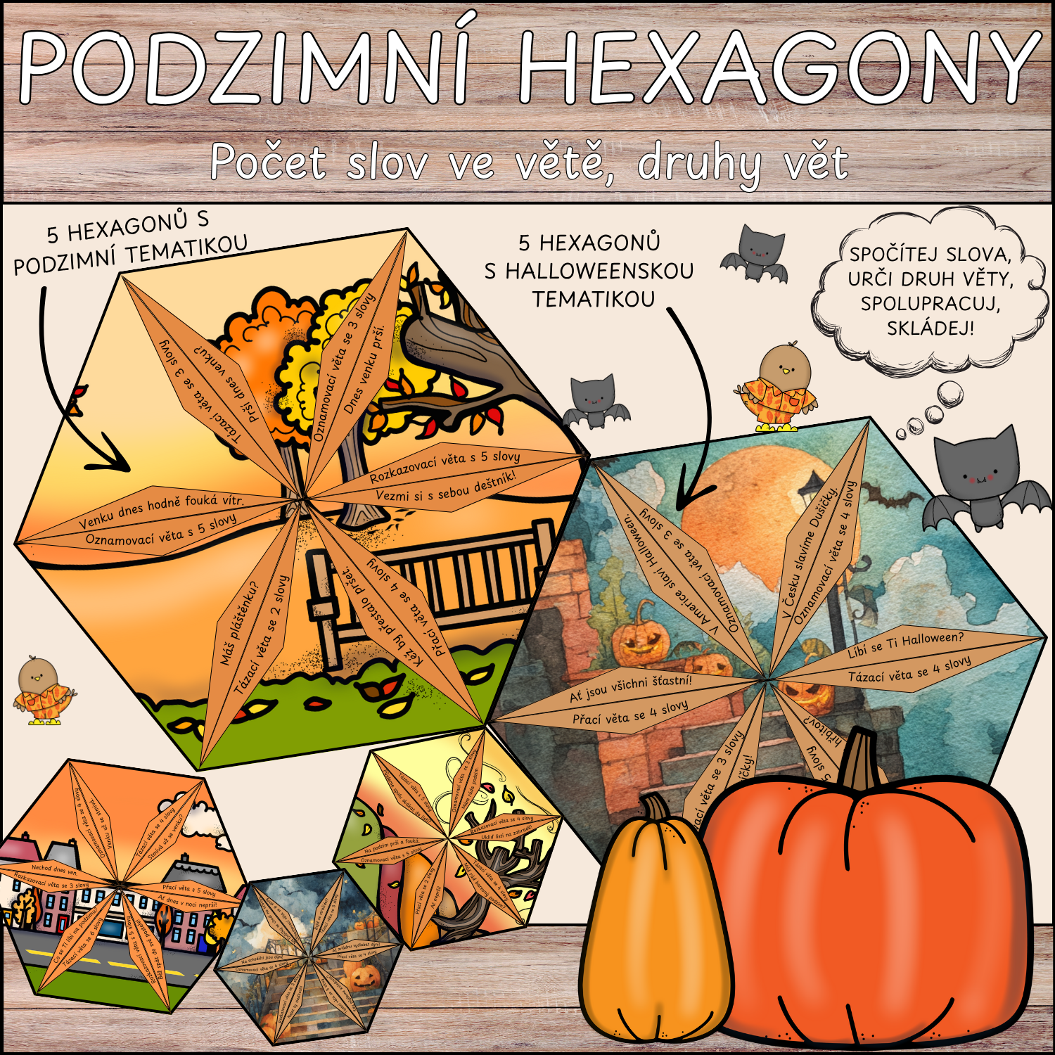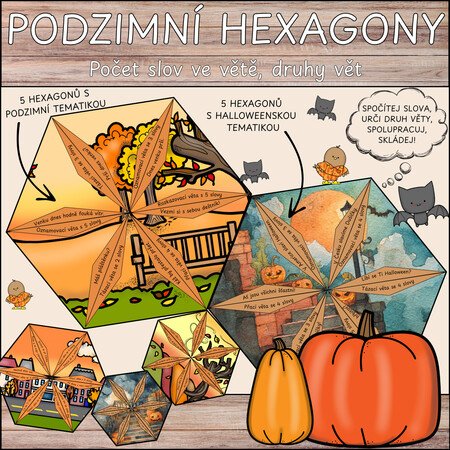 Materiál obsahuje skládací hexagony, pomocí nichž si žáci procvičují druhy vět a počítání slov ve větě. Celkem je připraveno deset hexagonů – pět s podzimní tematikou a pět s tematikou halloweenskou. Úkolem žáků je správně přiřazovat věty k popisům druhů vět tak, aby po složení vznikl tematický obrázek.