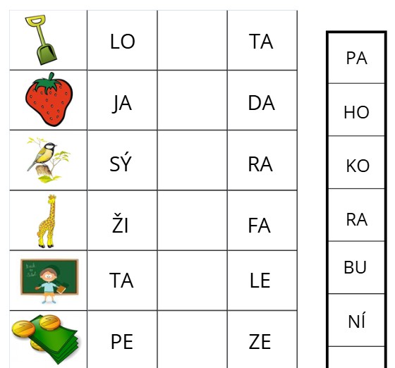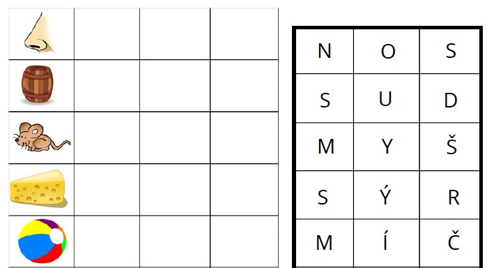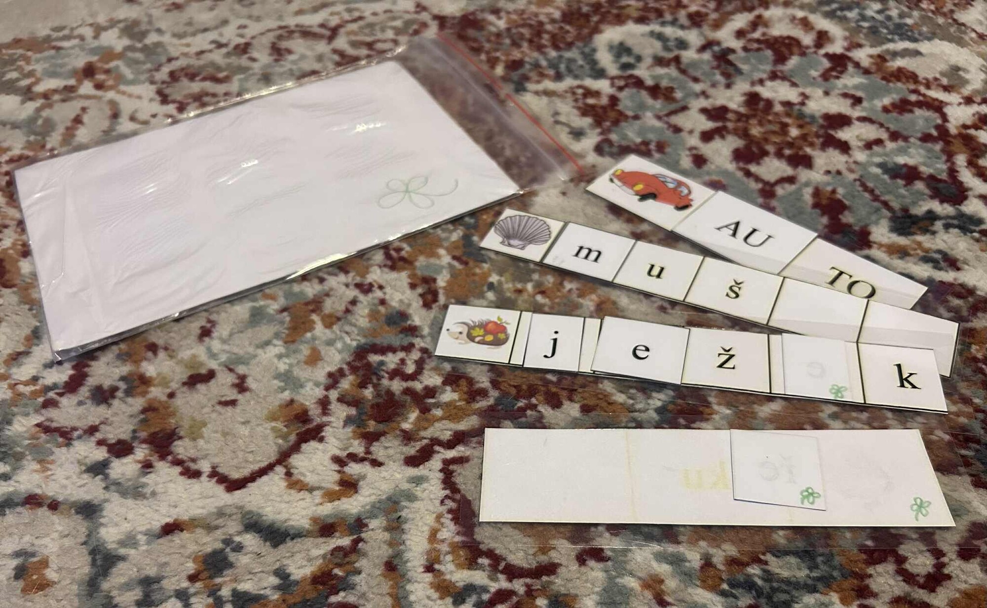 Děti si vyskládají karty s obrázky před sebe a do volných polí doplňují písmena ze sady.